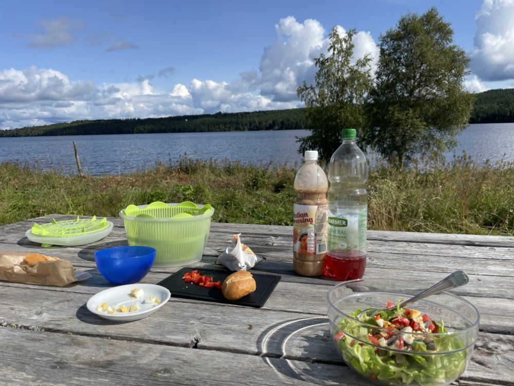 Das Wetter wird von Stunde zu Stunde schöner. Der Mittagshalt am See Storsjön können wir draussen geniessen.
