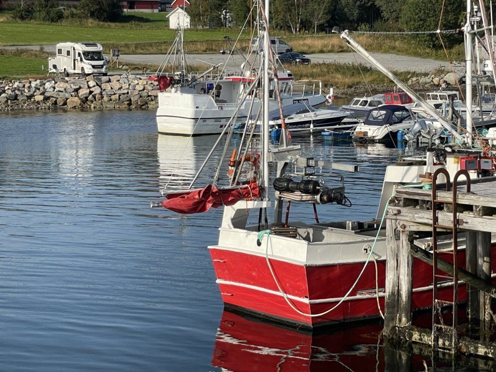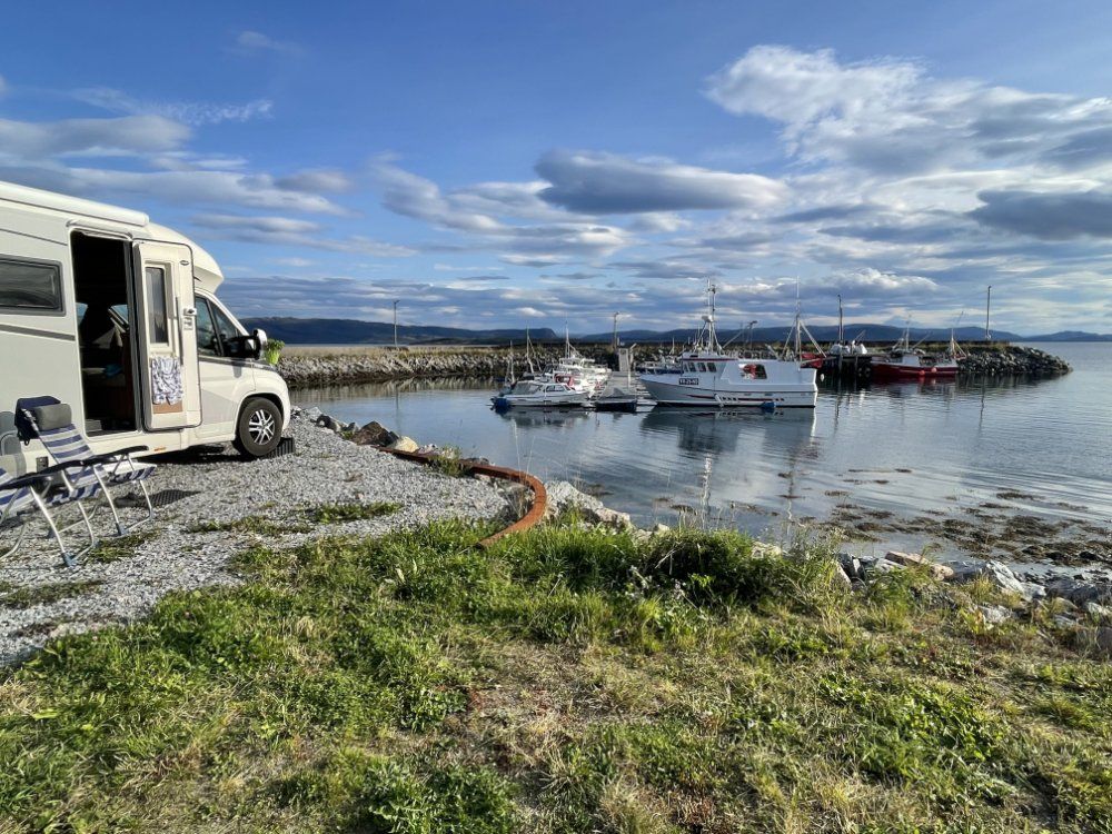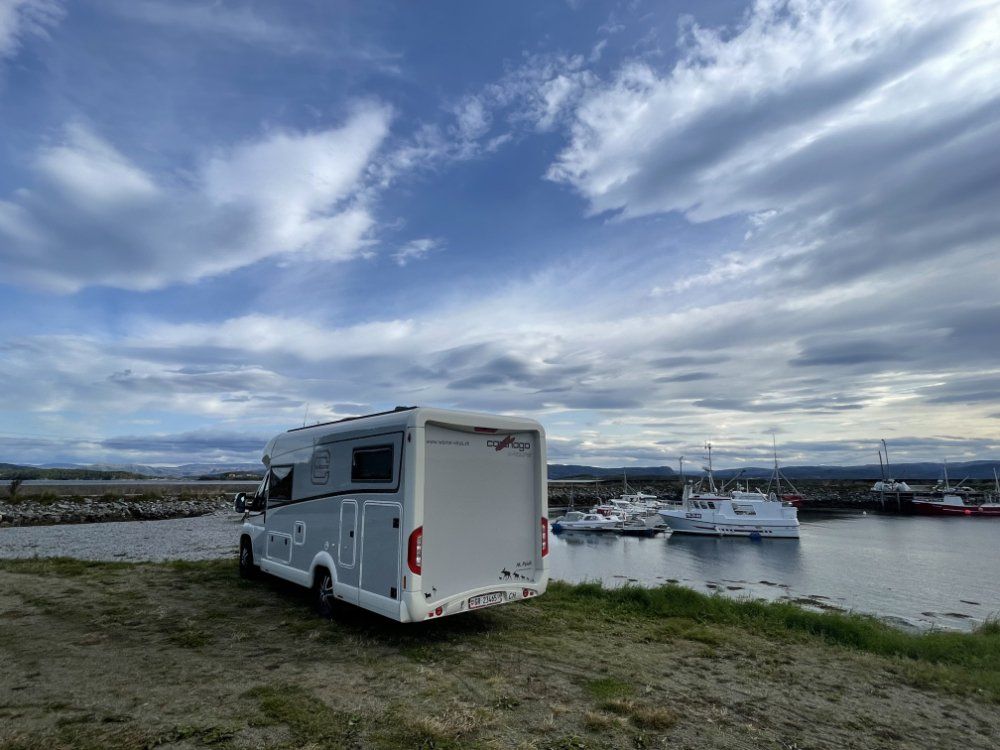 Im Fährhafen Gutvik haben wir gemütlich Zeit für einen kleinen Mittagsimbiss bevor um 13.10 Uhr die Fähre ablegt und 20 Minuten später die Insel Leka erreicht. Wir steuern direkt den Leka Camping an und beziehen den Panoramaplatz Nr. 1 mit der schönsten Aussicht nach Osten, Westen und Süden. Die Bewölkung hat leider wie vorhergesagt zugenommen und trotzdem laden wir noch die E-Bikes aus und machen eine erste Erkundungstour zur Südspitze der Insel. Schön!