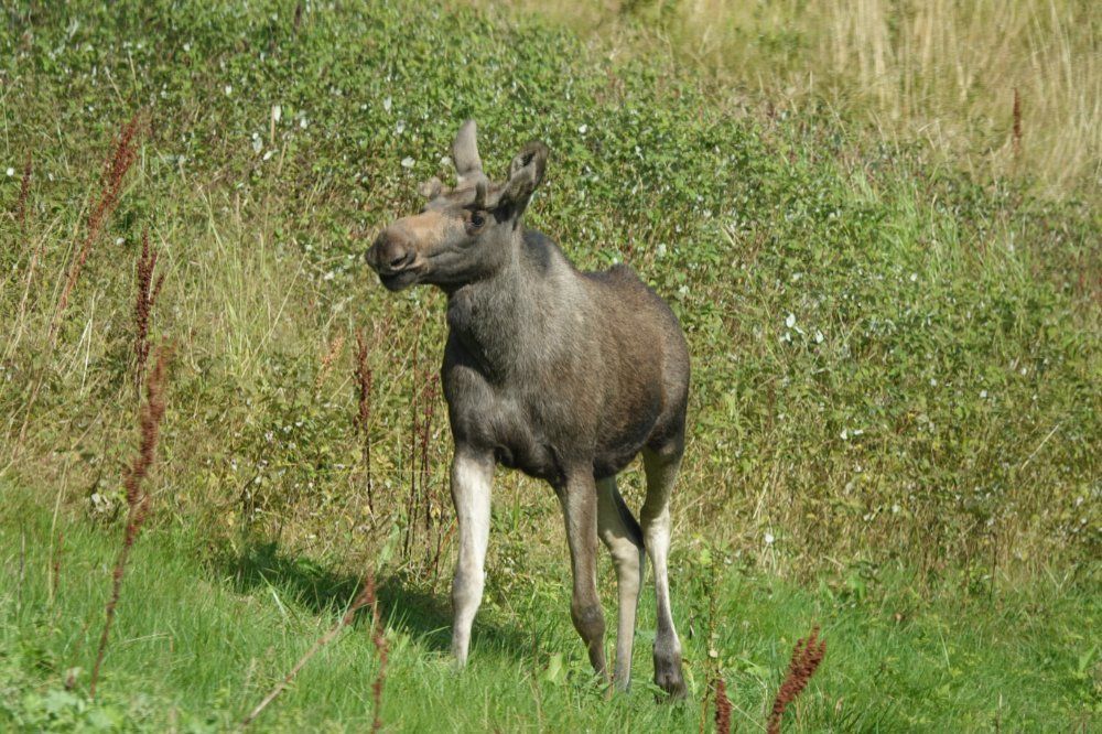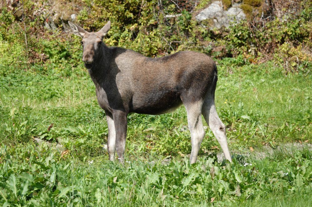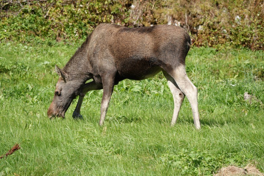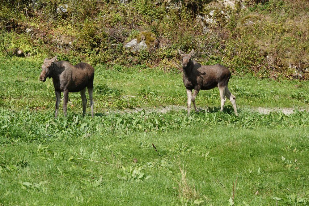 Dann zieht es uns aber weiter Richtung Insel Leka. Und da stehen sie plötzlich - zwei Elche. Erschrecken sie anfänglich wohl darüber, dass wir stoppen und nicht einfach vorbeifahren, lassen sie sich aber schnell nicht mehr stören und grasen friedlich weiter.