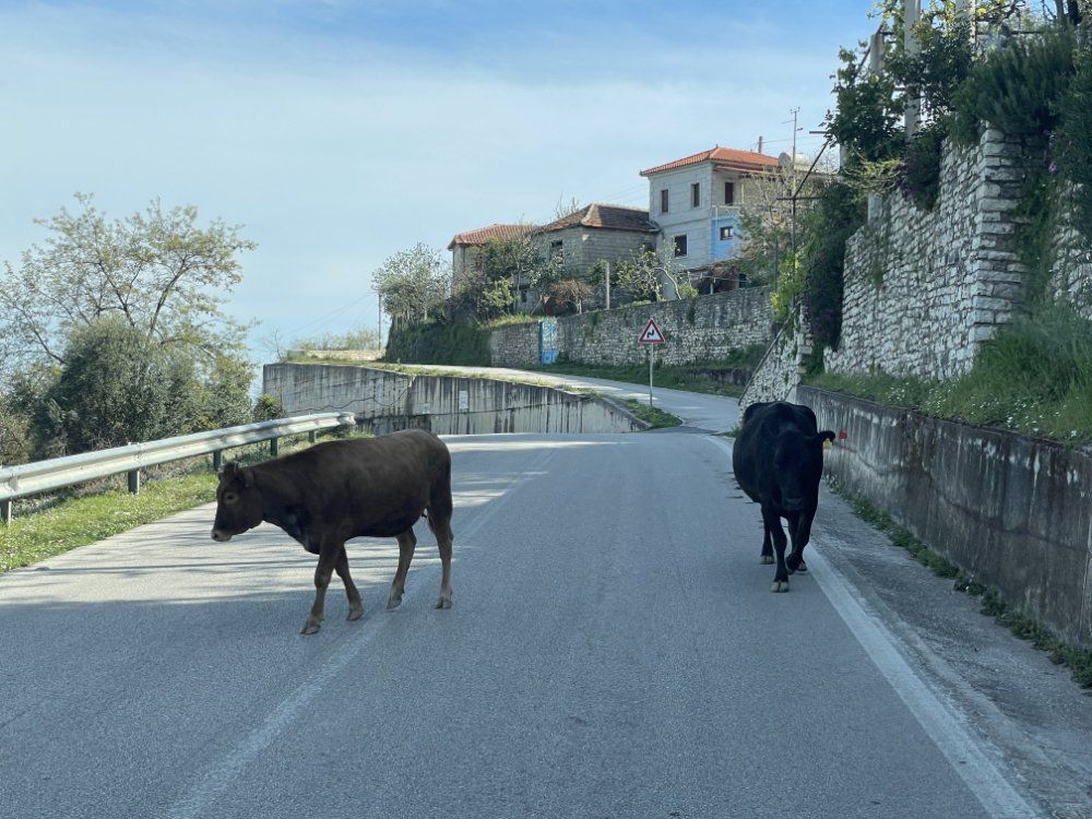 So gestärkt nehmen wir die weiteren vielen, vielen Kurven unter die Räder, durchqueren kleine Dörfer, staunen ob der Hotelanlagen die an den Stränden gebauten werden, weichen allen möglichen Verkehrsteilnehmern aus (Hunde, Ziegen, Schafe, Pferde und auch Kühen) und landen zum Schluss des Tages auf dem Stellplatz in Sarande direkt am Meer.