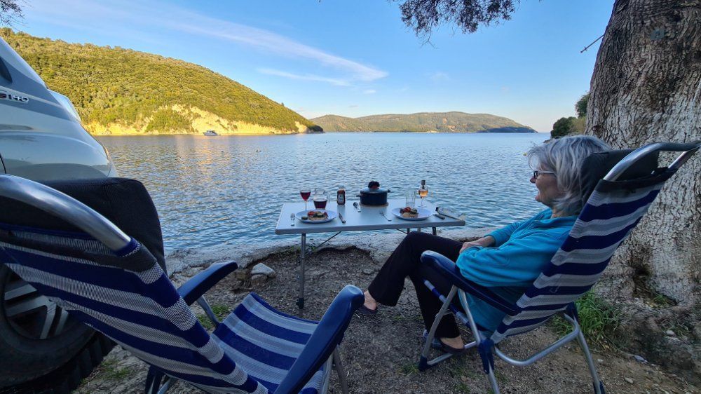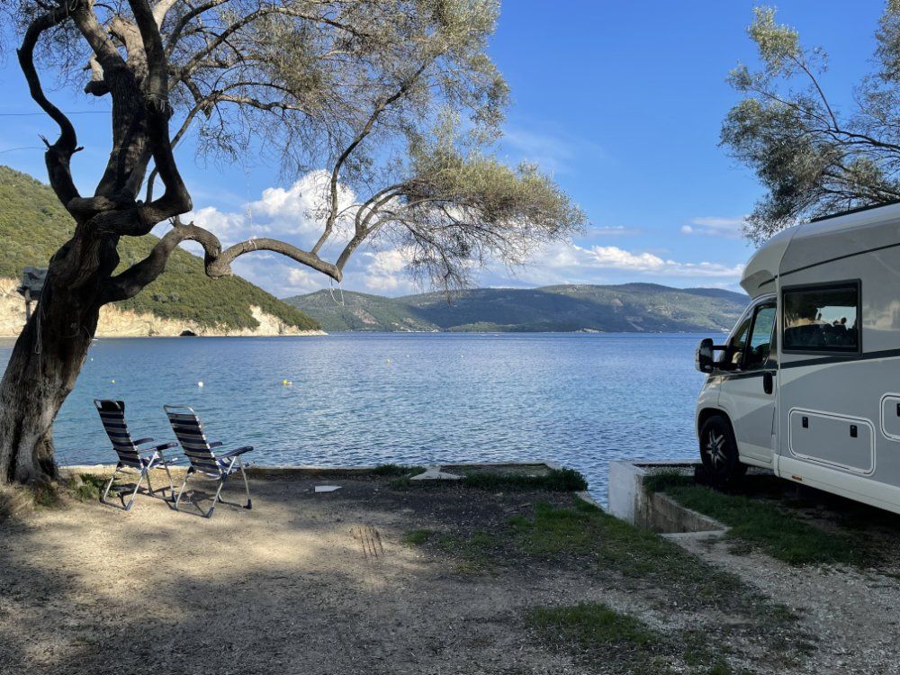 Tja und manchmal ist diese Suche halt auch mühsam. Wir fahren einiges weiter als geplant und landen schliesslich auf Lefkada auf dem Camping Desimi. Die Pfüdinase kann nicht näher am Wasser stehen, die Aussicht ist wunderschöne - wir sind zufrieden. Dank unserem Einkauf ist es auch nicht schlimm, dass das Restaurant noch geschlossen ist. Wir geniessen unser Nachtessen direkt am Meer.