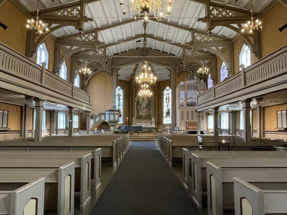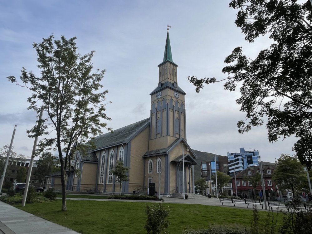 Wir planen nur von einem Tag zum anderen. So beschliessen wir erst heute morgen doch raus nach Tromsozu fahren. Das Wetter soll gar nicht schlecht sein. Wie man unten sieht strahlt ein stahlblauer Himmel hinter derEismeerkathedrale.