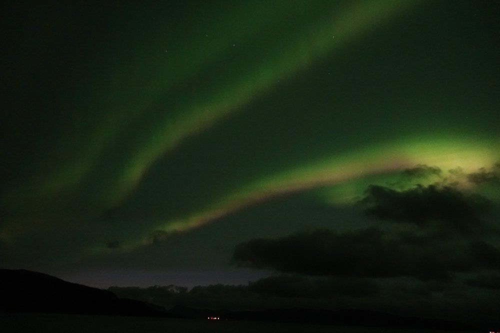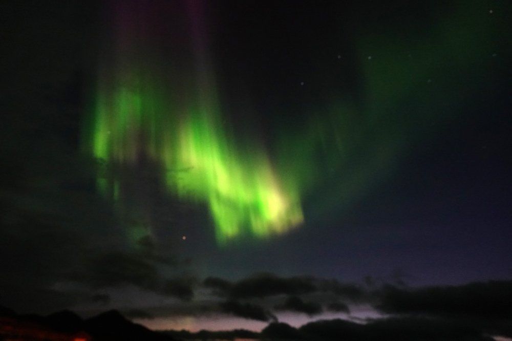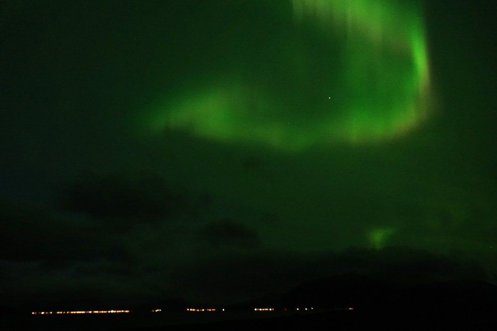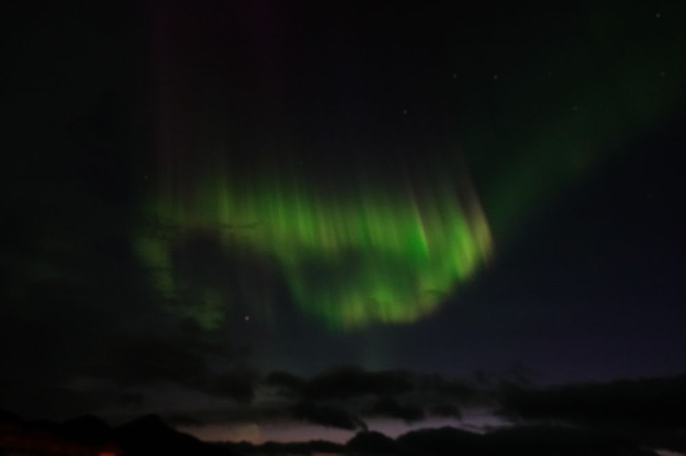Völlig überraschend hatten wir gestern Abend plötzlich einen recht klaren Sternenhimmel. Und wir stehen an einem perfekten Platz für die tanzenden Lichter. Leider sind sie etwas schwach, aber wir geniessen es sehr und es ist bereits Sonntag, bis wir endlich ins Bett kommen.