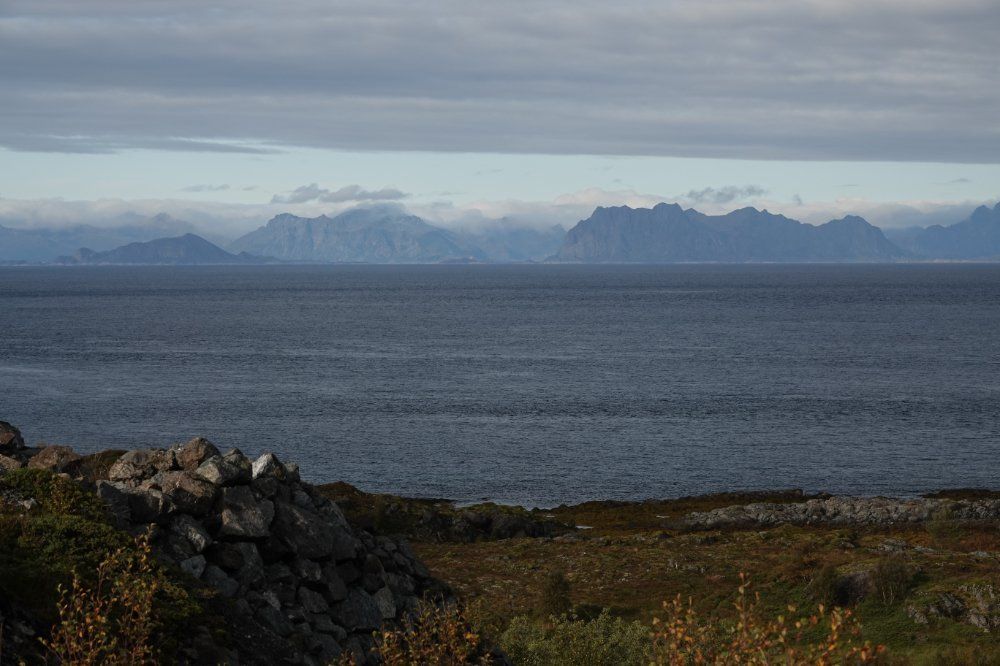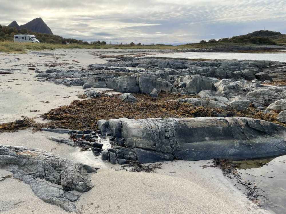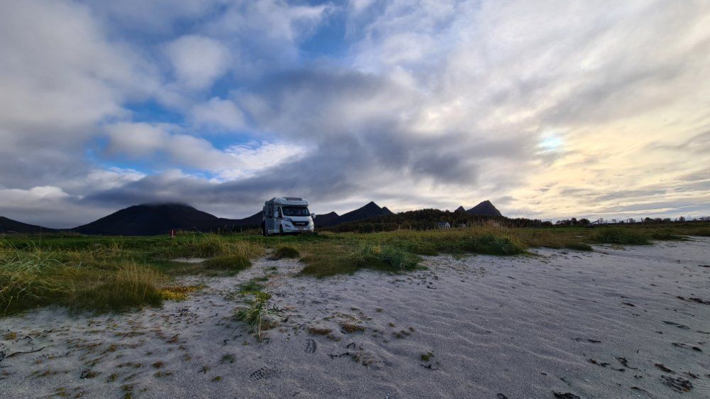 In Innhavet stoppen wir kurz für einen kleinen Einkauf und dann stellen wir den Blinker und fahren raus Richtung Steigen. Die Auslicke auf die Lofoten sind gigantisch. Unser Ziel ist ein Stellplatz auf der Insel Engeloya.