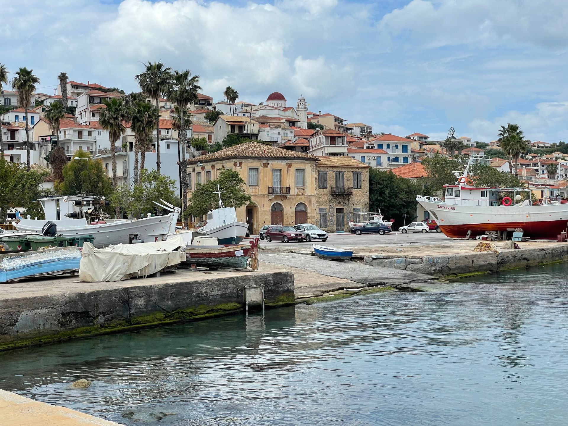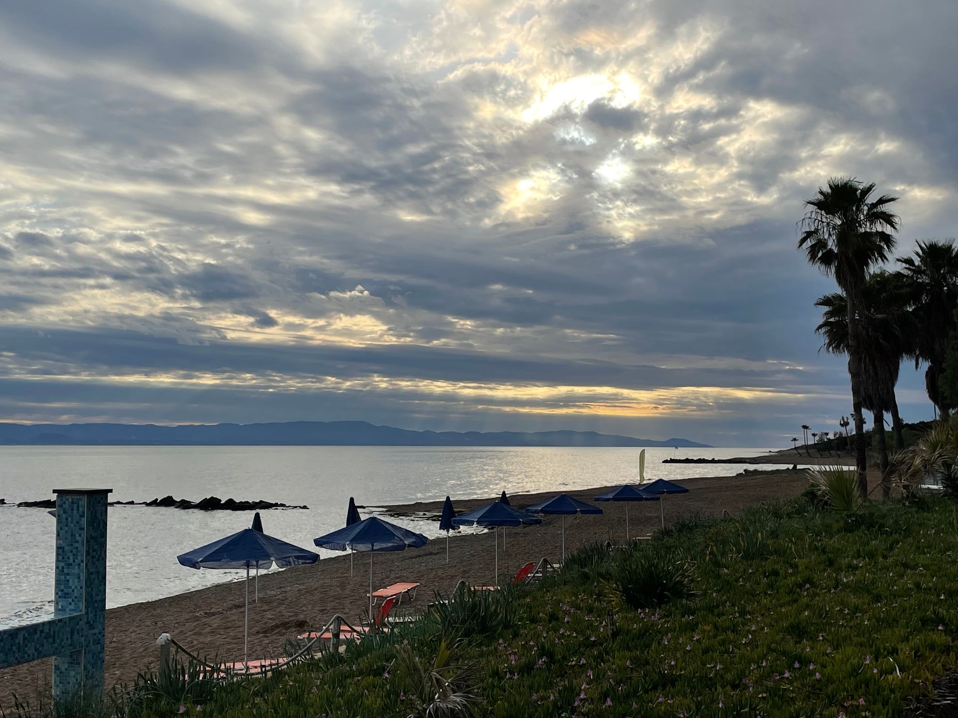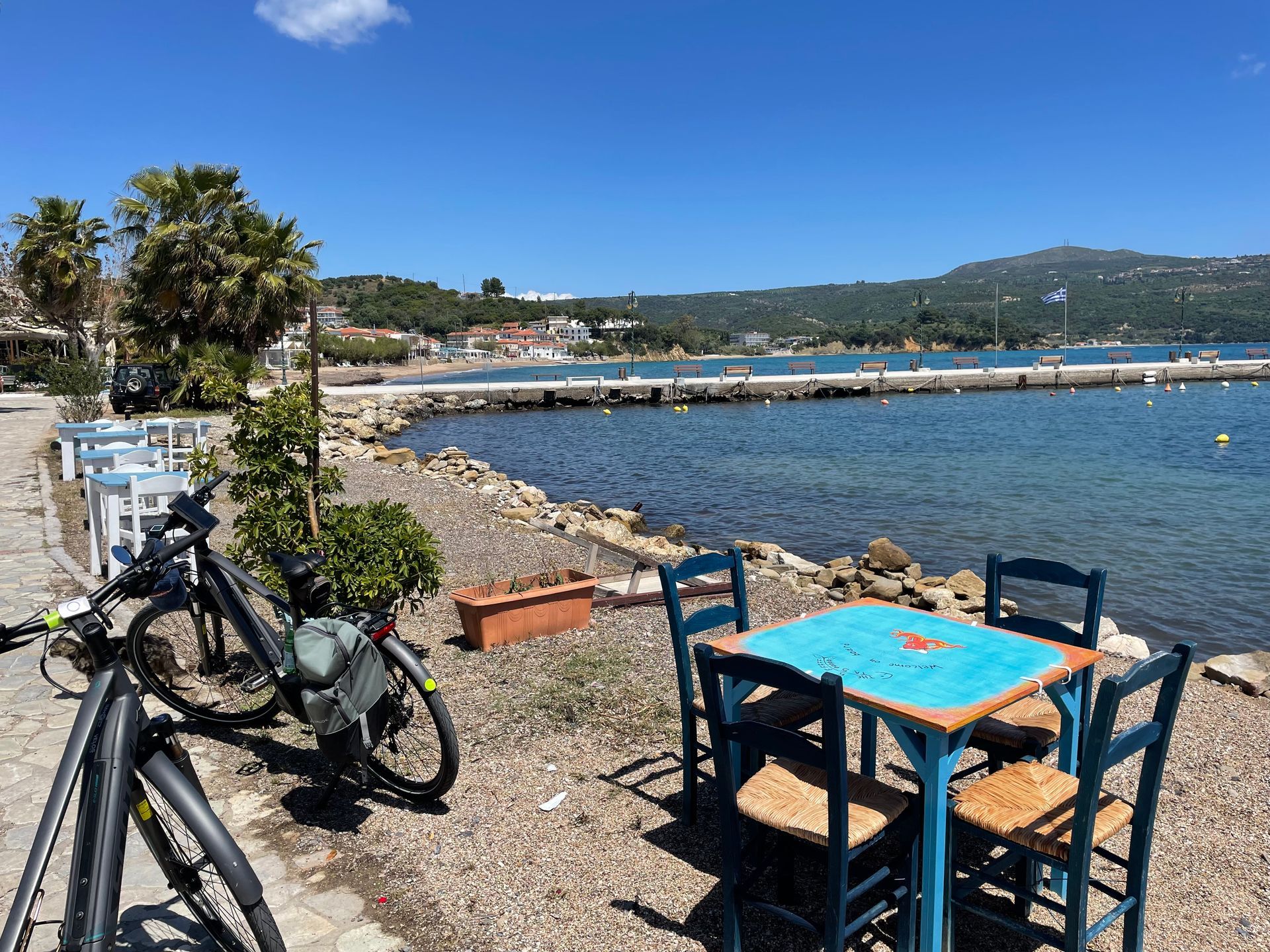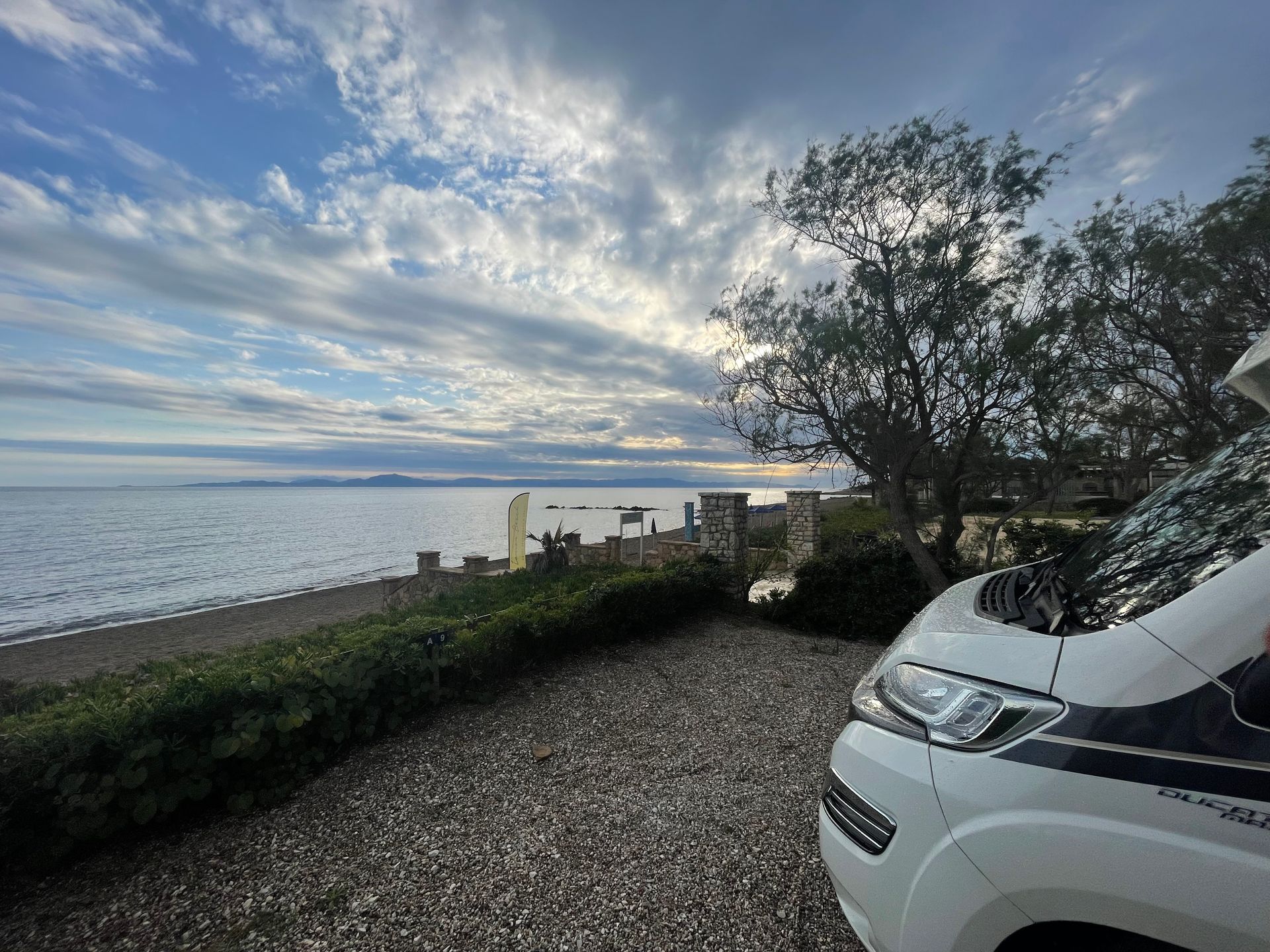 Finikounda soll ein hübsches Fischerdorf sein. Auf dem Camping Thines erwischen wir den letzten sonnigen Platz mit direktem Meerblick.
