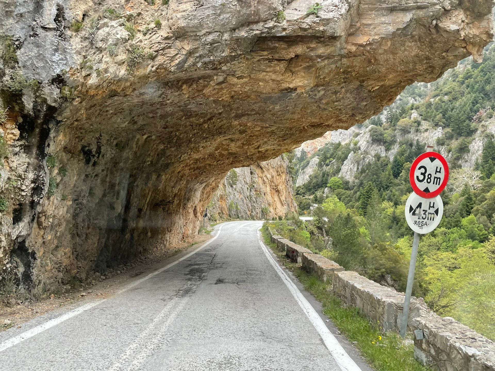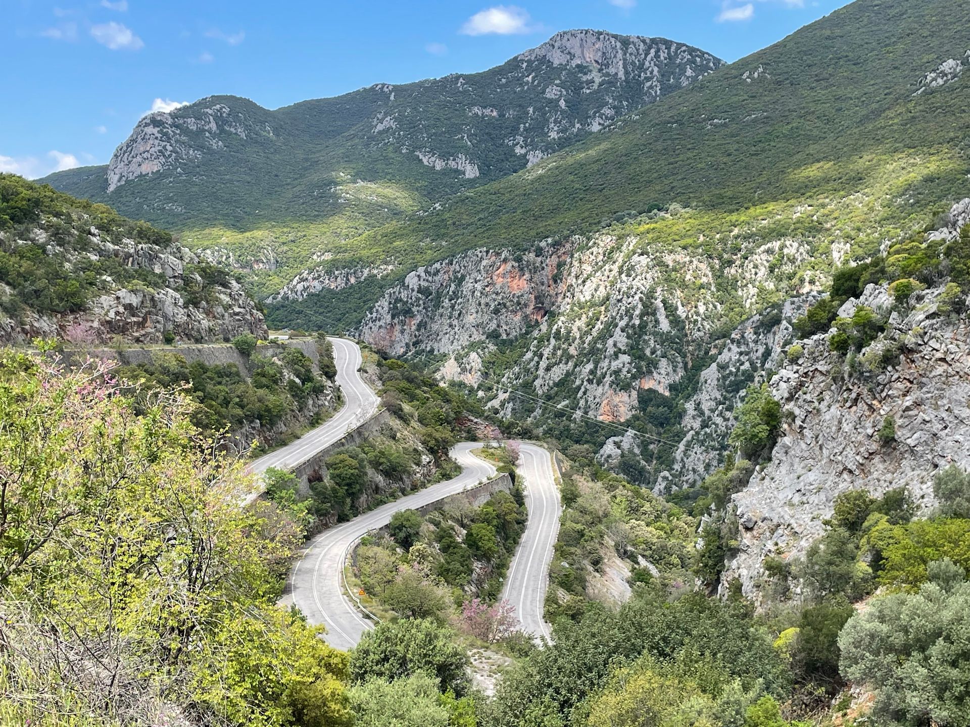 In allen Belangen gut gefüllt machen wir uns auf den Weg nach Mystra. Dazu nehmen wir die Strasse 82, die geniale Landschaften für uns bereit hält. Zuerst steigen wir in die Höhe und geniessen die Aussicht auf Kalamata. Plötzlich gehts in Serpentinen hinunter in eine spektakuläre Schlucht. Irreführende Verkehrsschilder weisen immer mal wieder darauf hin, dass die Strecke gesperrt sei. Ok, ein paar Baustellen müssen wir passieren, aber sonst kommen wir ohne Probleme durch. Erklimmen dann auch noch eine Passhöhe und dann gehts steil hinunter und wieder durch eine Schlucht Richtung Mystras.