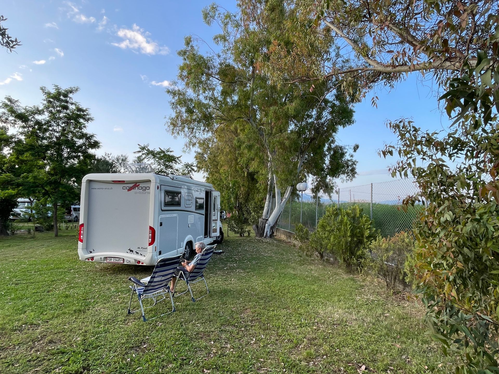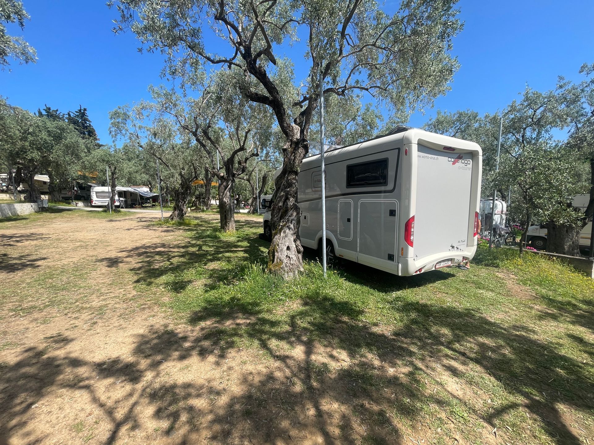 Der Empfang auf dem Camping Hellas ist sehr herzlich und mit Elan und Geduld werden uns einige Stellplätze gezeigt. Da wir halt manchmal auch etwas wählerisch sind dauert das länger, aber der Andrang ist zur Zeit nicht gross und die Dame hat Zeit. Wir unterhalten uns bestens und lachen viel bei der Suche nach dem optimalen Platz. Vorne am Meer ist logischerweise nichts frei, der Platz ist sowieso recht gut belegt.