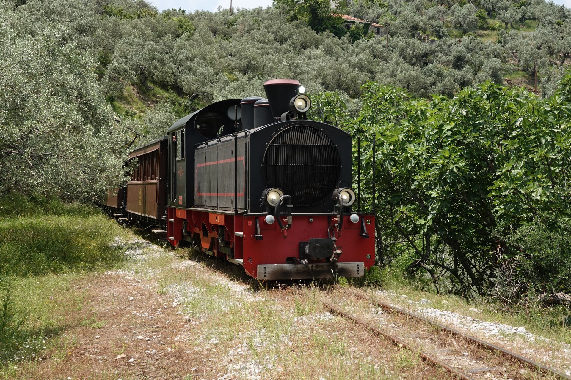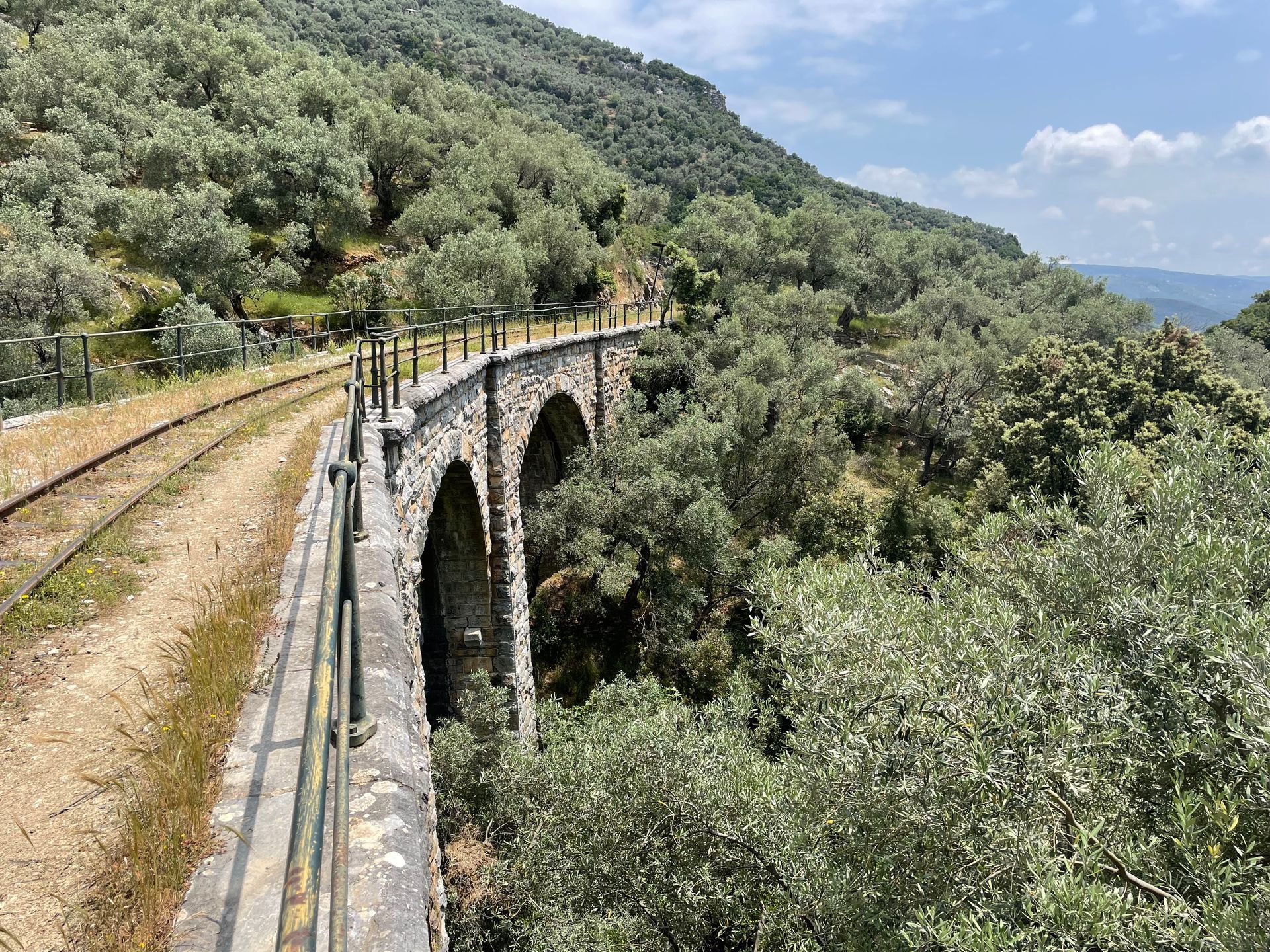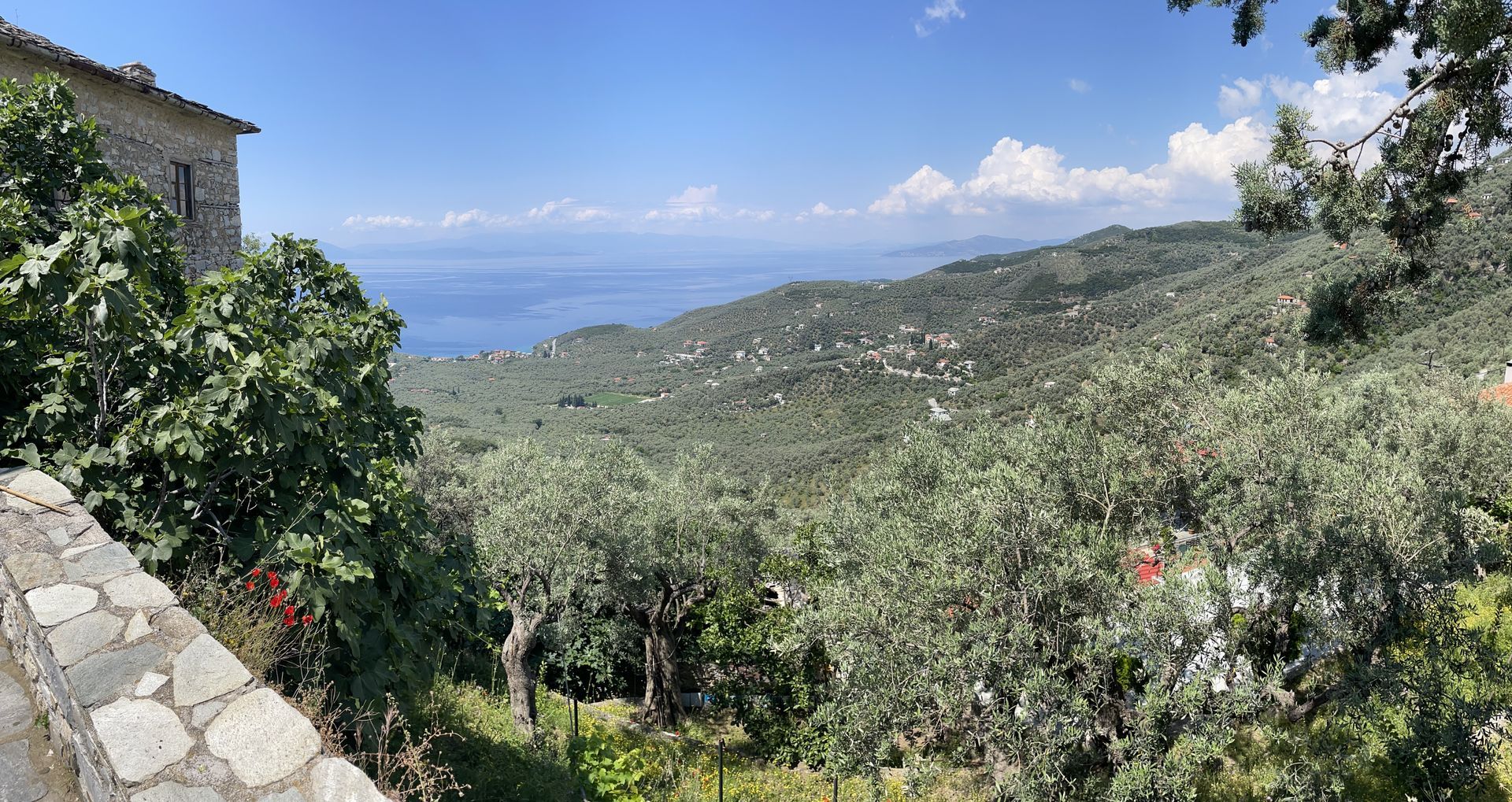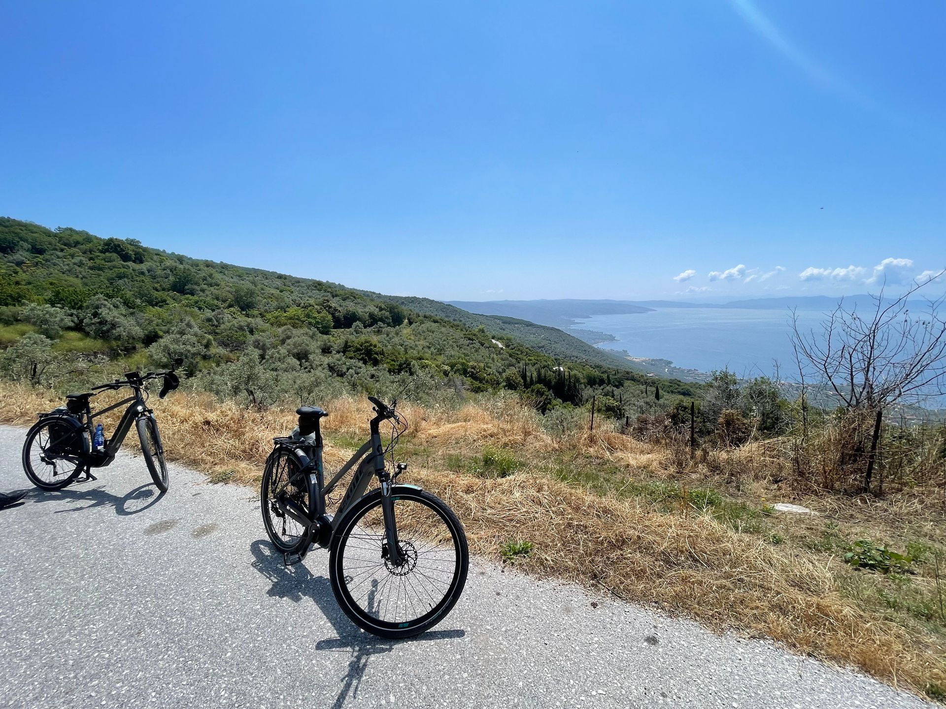 Heute gehts mit den E-Bikes noch weiter nach oben. Da die Küstenstrasse sehr stark befahren ist weichen wir aus und fahren in die Höhe. Hansruedi hat auf Komot eine tolle Rundtour herausgesucht. Nach 12 km haben wir 700 Höhenmeter überwunden und geniessen die Aussichten. Wir durchfahren auch schöne, urige Dörfer - Pinakates, Vyzitsa und Miles. Wobei in Miles am meisten los ist. Hier ist die Endstation der Museumsbahn - Souvenirshops und viele Restaurants säumen die Dorfstrasse, dabei ist der Bahnhof sehr weit vom Dorfkern entfernt. Das Dorf scheint aber auch sonst ein beliebtes Ausflugsziel zu sein. Für griechische Verhältnisse gibt es hier viele Parkplätze.