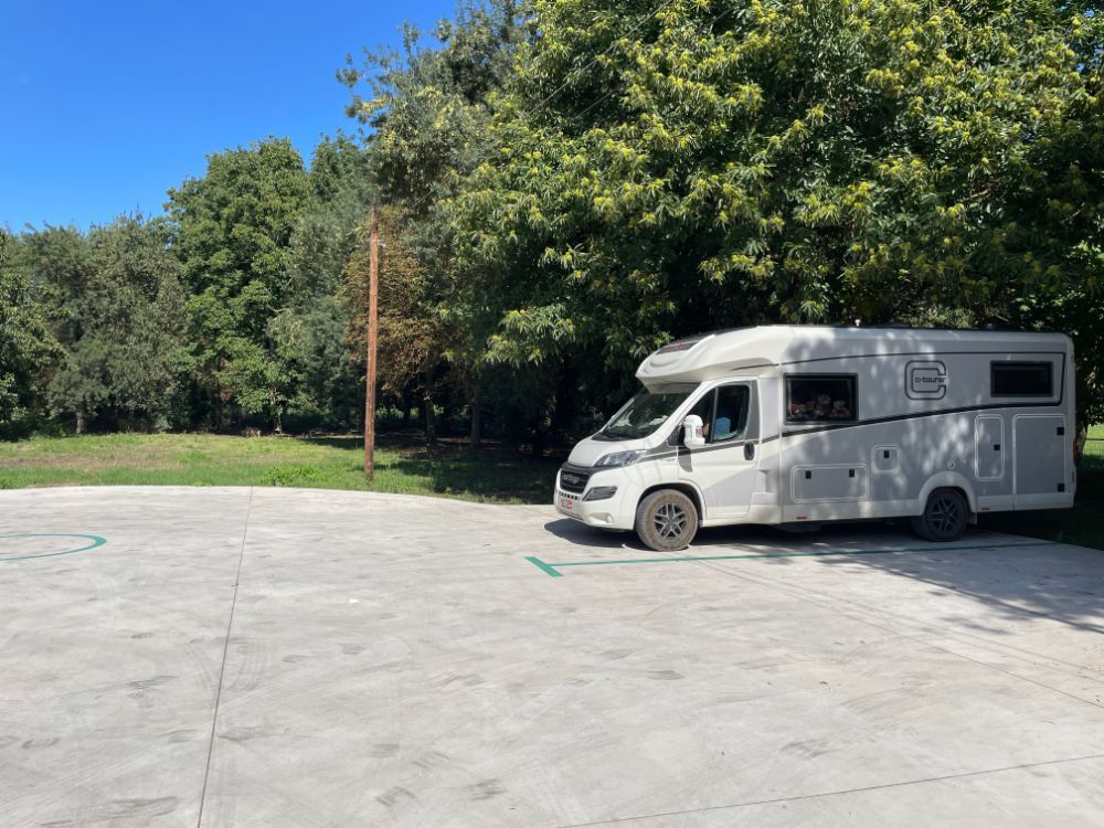 Nun der Stellplatz ist kurz vor dem Dorf. Auch hier recht nahe an einer Strasse, aber wir können in der hinteren Reihe rückwärts in die Ecke parkieren und beschliessen - das geht.