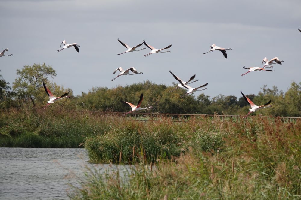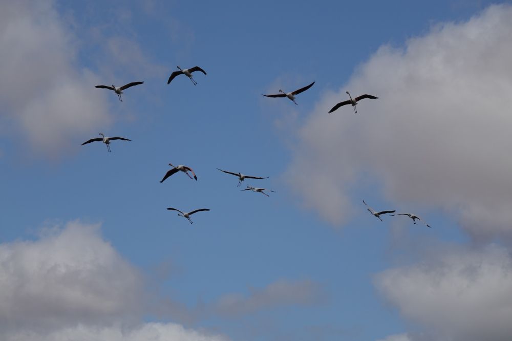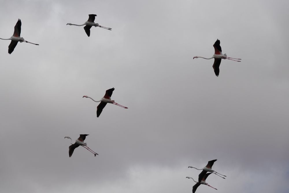 Wir fahren erst einmal ganz nach vorne. Zur Zeit ist nur der gelbe Rundgang offen. Wir spazieren gemütlich über die Holzstege und beobachten dies und das. Eine Kolonie von Flamingos startet zu einem Rundflug. Aber sonst ist natürlich in dieser Jahreszeit nicht gerade viel los in der Vogelwelt.