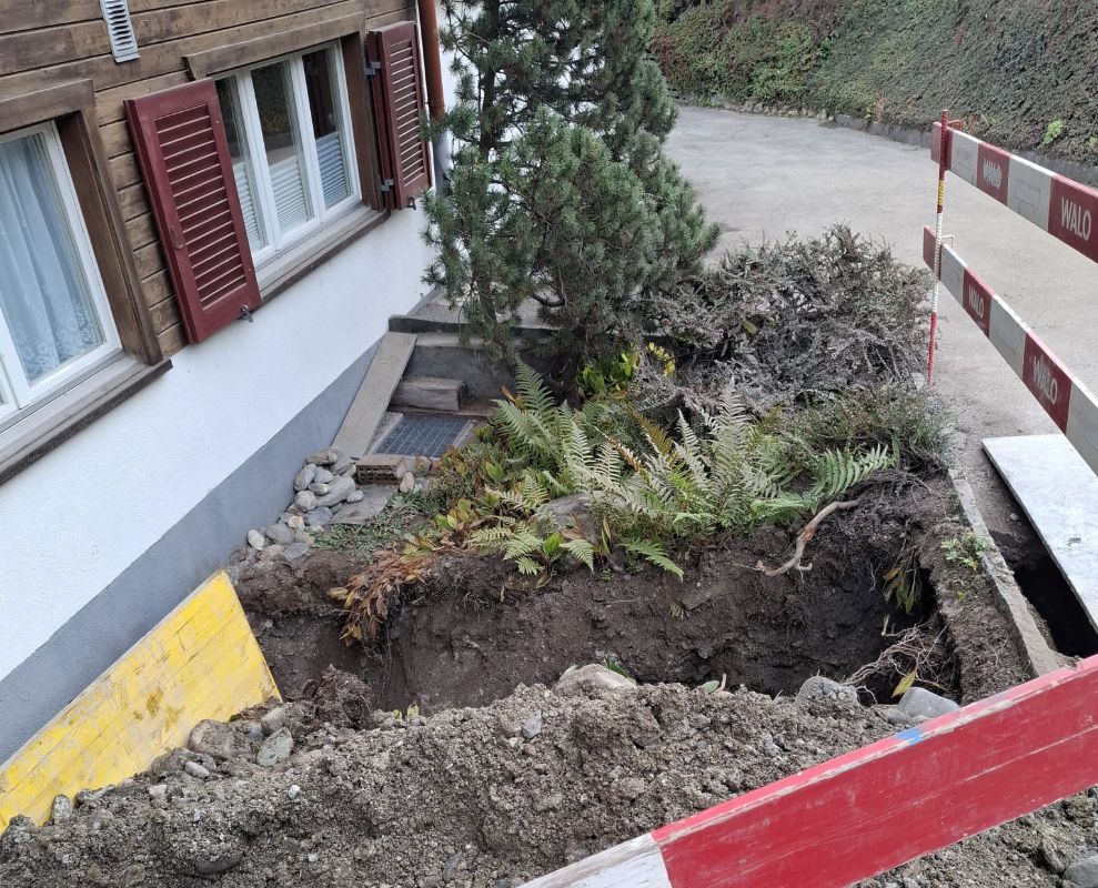Der Grund für diese Aktion: Wie die Zufahrt ab Montag und für die nächsten 4-5 Wochen aussehen wird, wissen wir erst, wenn der Graben ausgehoben ist und die Notdurchfahrtsstrasse erstellt ist. Ob die Durchfahrt dann auch wirklich 2.50 Breite aufweist - hmm..., es hat schon so viel nicht geklappt, wie geplant und angekündigt.