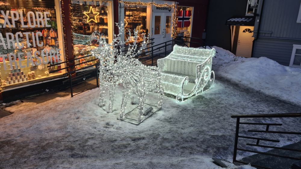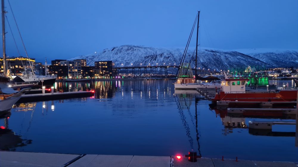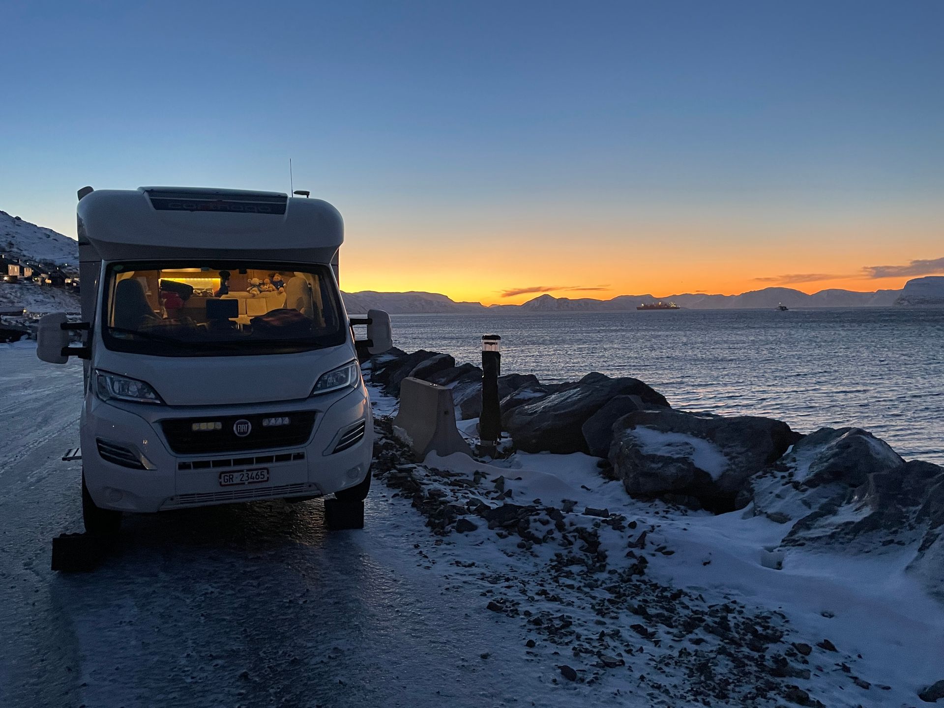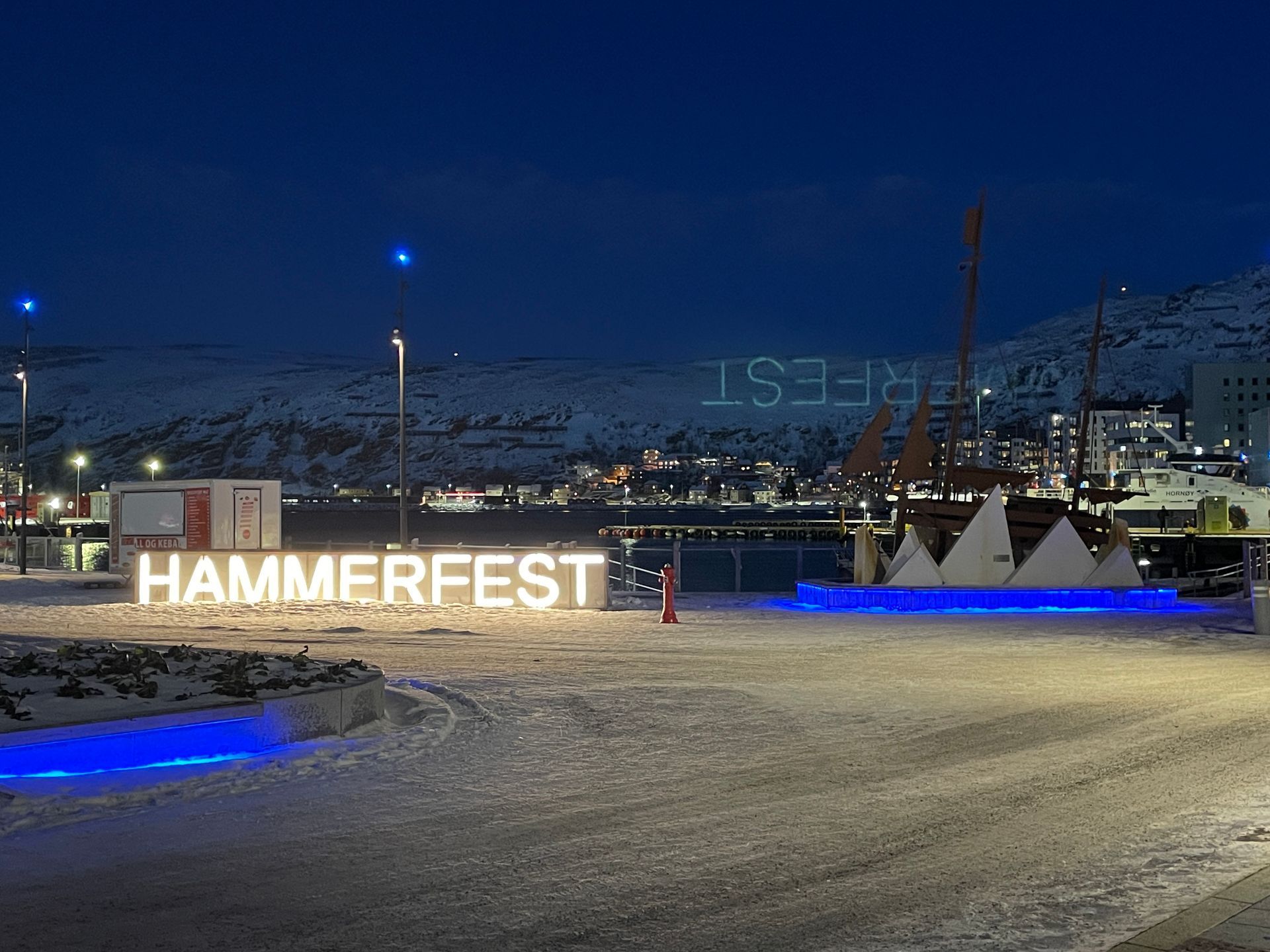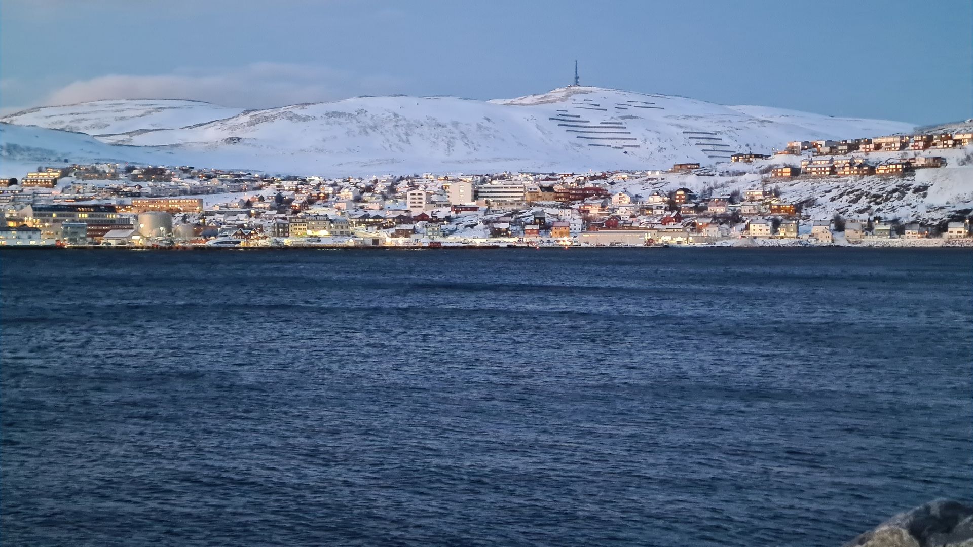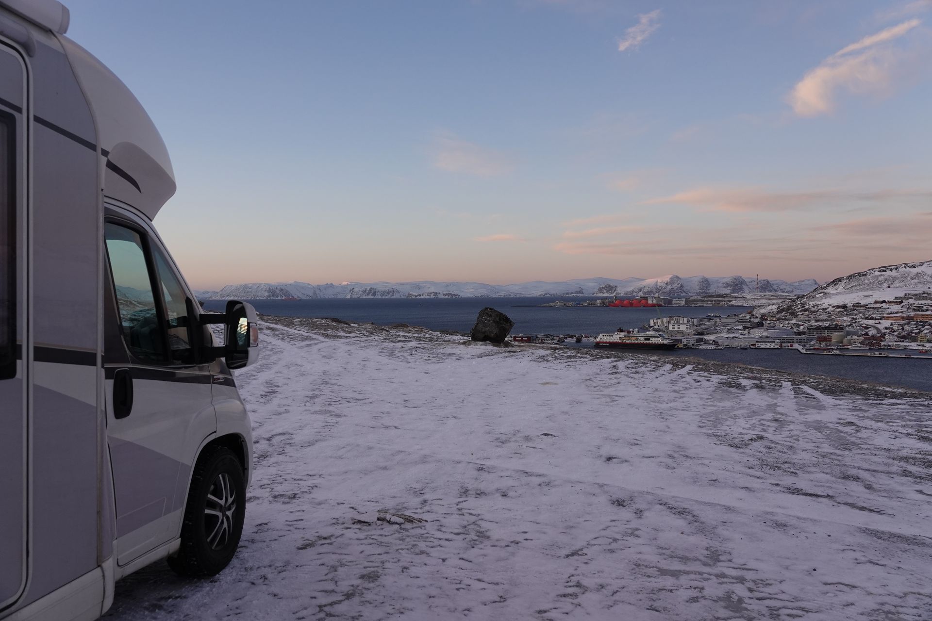 Wir fahren auch noch raus nach Forsol, aber der Übernachtungsplatz hier ist schlecht geräumt und irgendwie macht es uns auch nicht an, hier zu bleiben. Also kehren wir zurück in die Stadt auf den Stell-/Parkplatz, richten uns etwas ein und dann geht's auf einen Spaziergang durch das mittlerweile nächtliche Hammerfest.