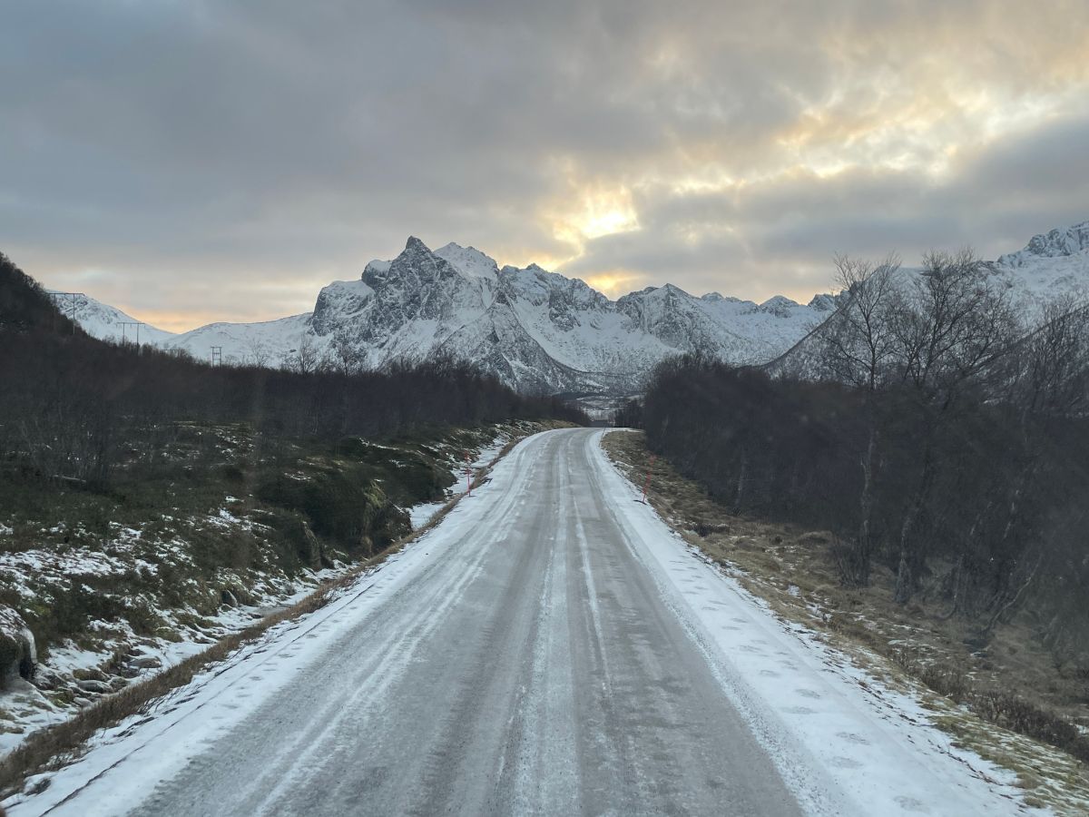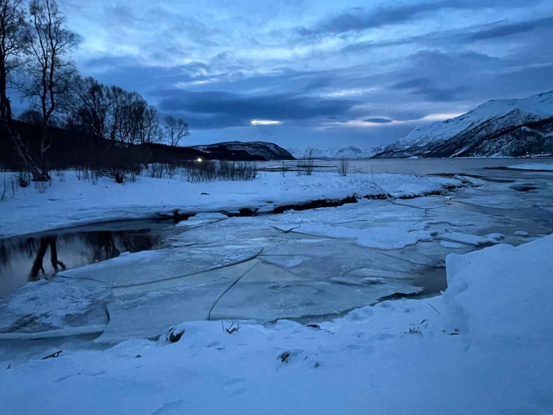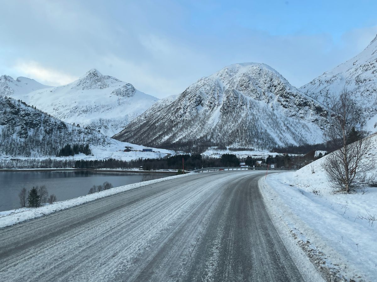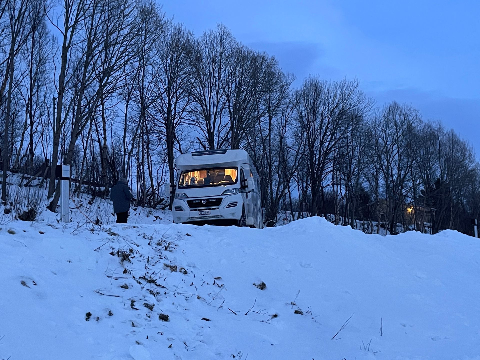 Gestern Abend konnten wir auf dem Übernachtungsplatz in Straumsnes unsere Fussspuren in den Schnee setzten und heute Morgen wäre man am besten mit Schlittschuhen bedient! Eine stürmische und regenreiche Nacht liegt hinter uns und so hat sich das Schneefeld in ein Eisfeld verwandelt.