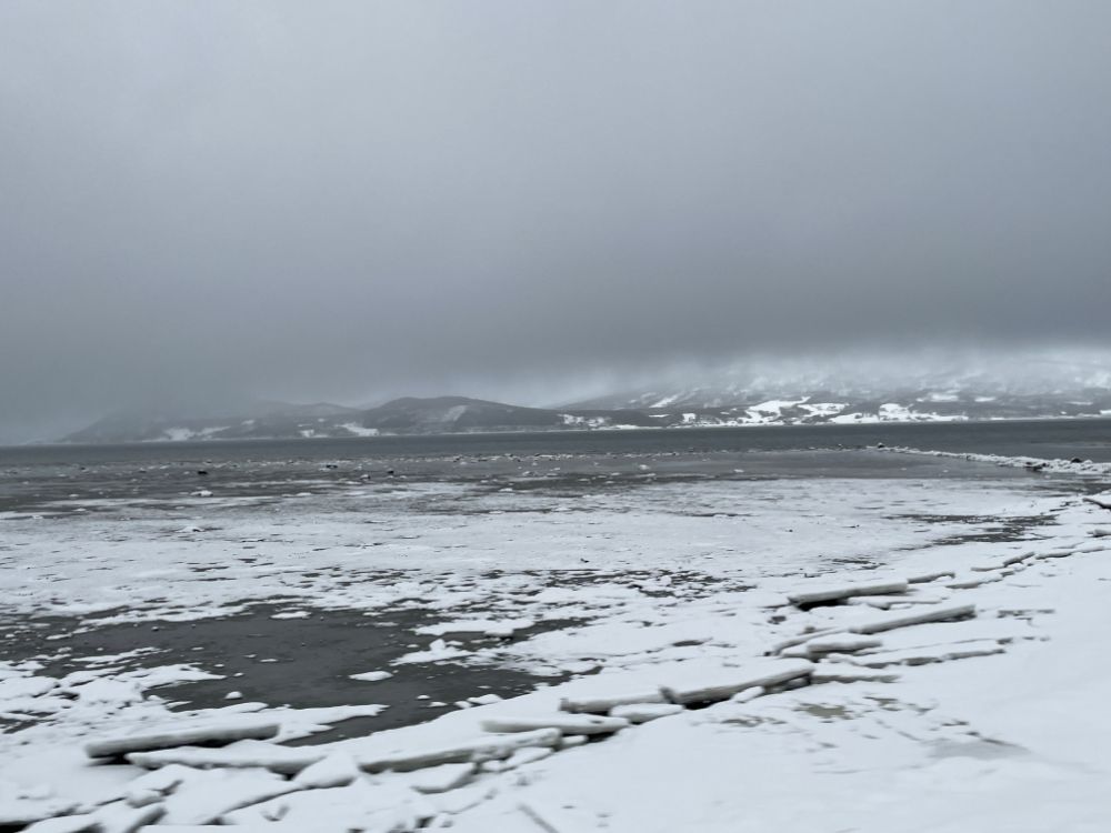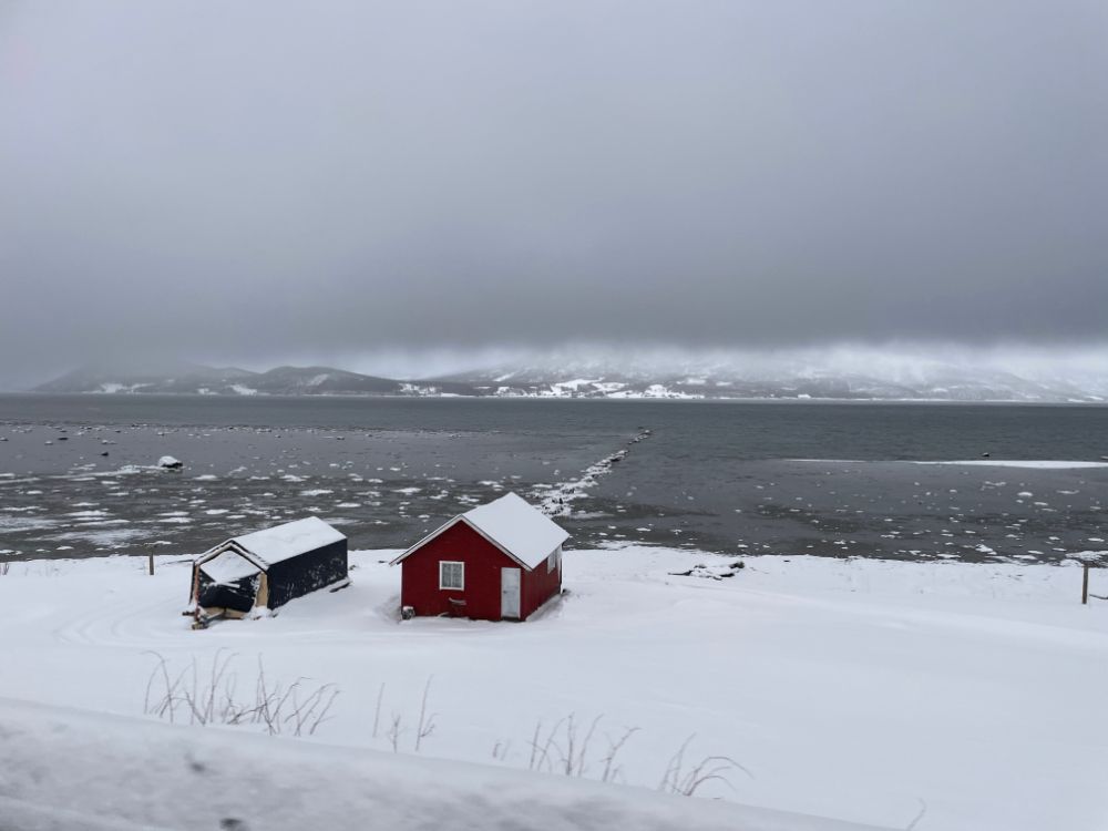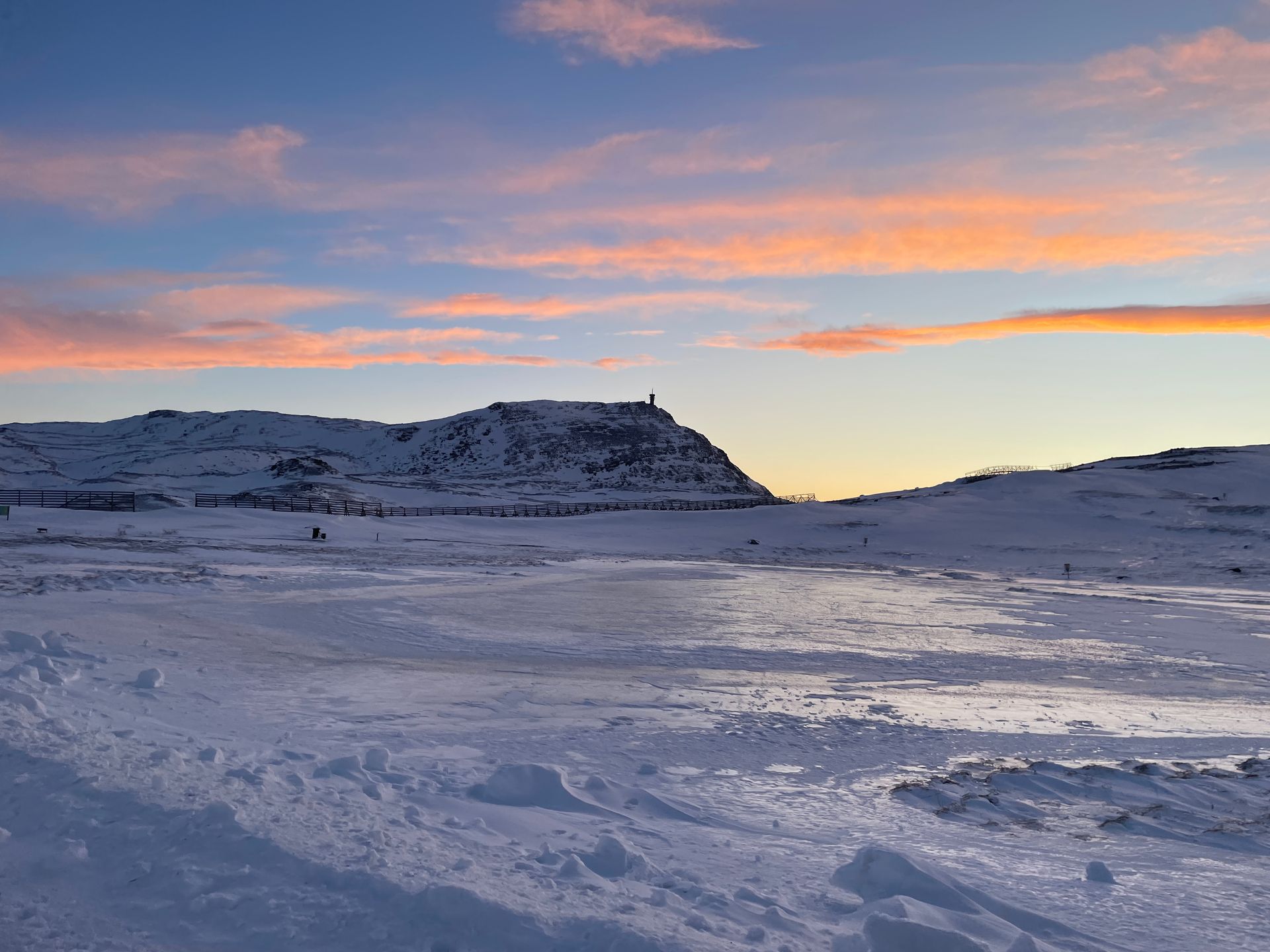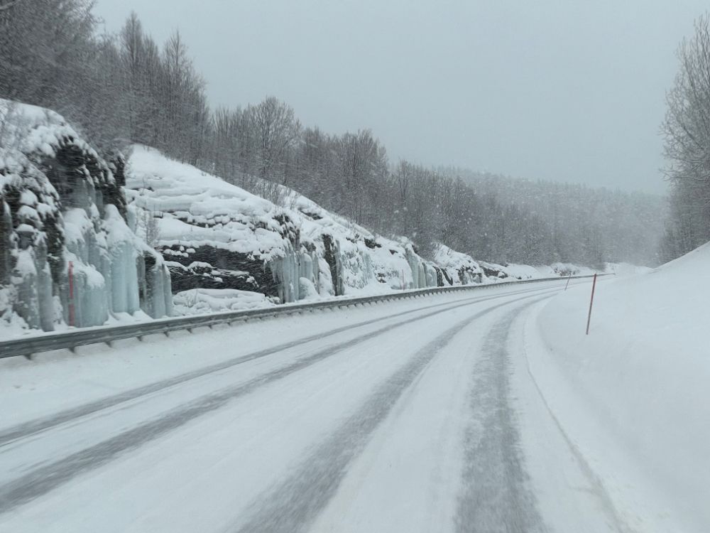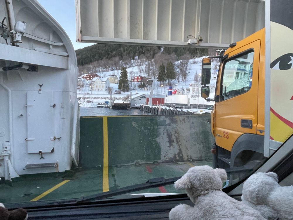 Gestern Abend konnten wir auf dem Übernachtungsplatz in Straumsnes unsere Fussspuren in den Schnee setzten und heute Morgen wäre man am besten mit Schlittschuhen bedient! Eine stürmische und regenreiche Nacht liegt hinter uns und so hat sich das Schneefeld in ein Eisfeld verwandelt.