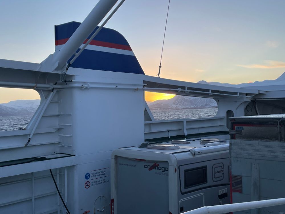 Die Fahrt nach Hammerfest ist bei diesem phantastischen Wetter ein perfektes Erlebnis. Die Sonne lacht uns zwischendurch mitten ins Gesicht.