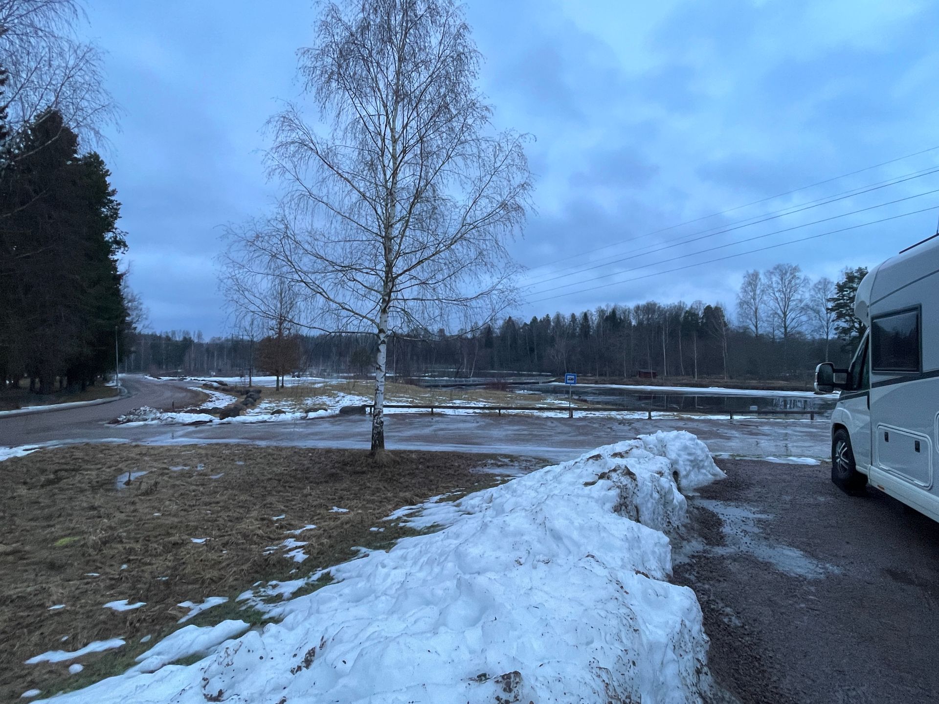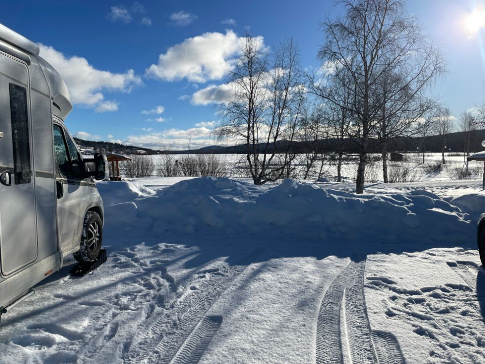 Im Winter gibt es auf dem Platz hier keine V/E. Dafür fehlt in diesem Jahr die Barriere und wir müssen somit nichts bezahlen. Ob die Barriere bewusst abgeschraubt wurde, oder ob sie defekt ist und darum fehlt, wissen wir nicht. Letztes Jahr im März mussten wir 200 SEK bezahlen.