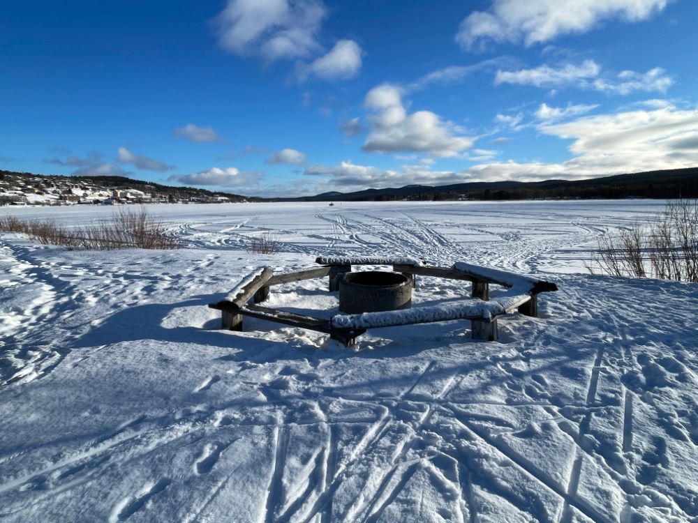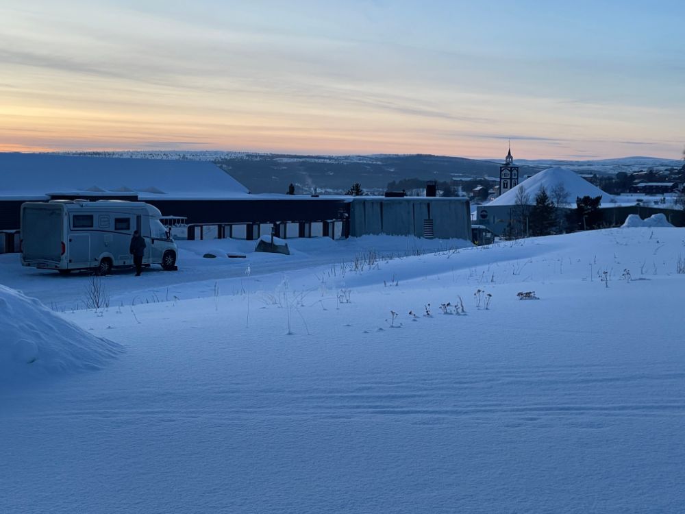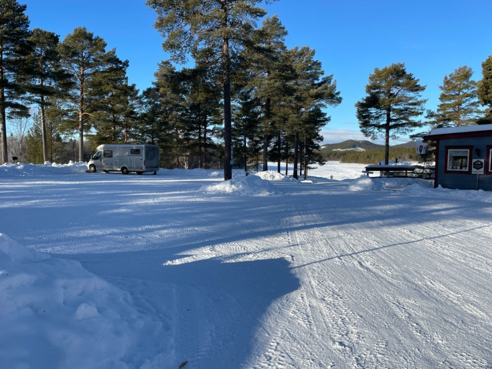 Nach gut einer Stunde sind wir bereits da. Wir stehen auf einem Parkplatz direkt am See Funäsdalsjön in Funäsdalen. Es gibt hier 6 Stellplätze. Auch ein WC steht zur Verfügung und im Sommer kann man sogar Wasser auffüllen. Die Entsorgung für Schwarz- und Grauwasser und den Abfall ist einige Kilometer entfernt. Wie schon gestern werden wir hier wahrscheinlich ganz alleine übernachten.