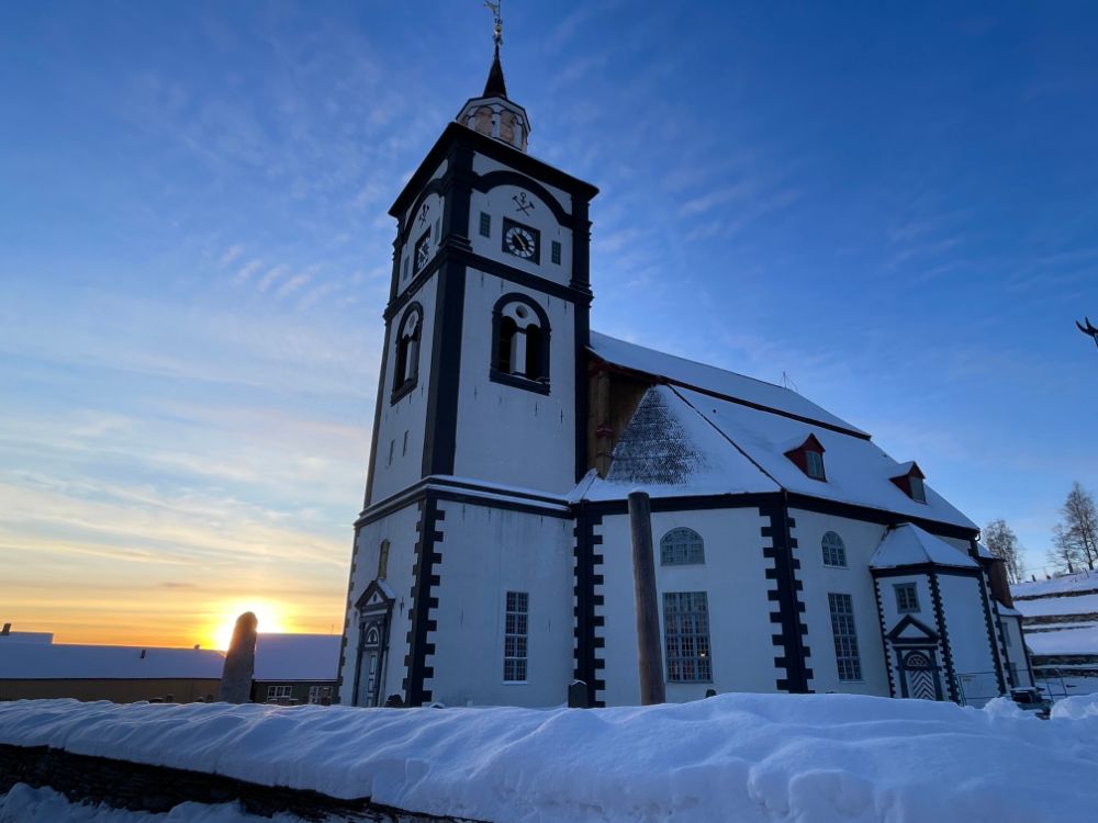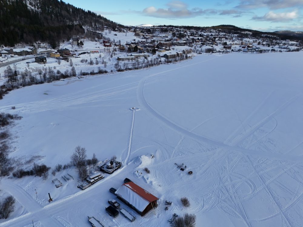Ein kleiner Weiler mitten in der Natur direkt am See Femunden. Ein paar Häuser, ein kleiner Supermarkt, ein Café, ein Restaurant, ein kleiner Fährhafen und naürlich eine Kirche. Der Campingplatz liegt etwas ausserhalb und bei der Fahrt durch das kleine Dorf sehen wir gerade einen