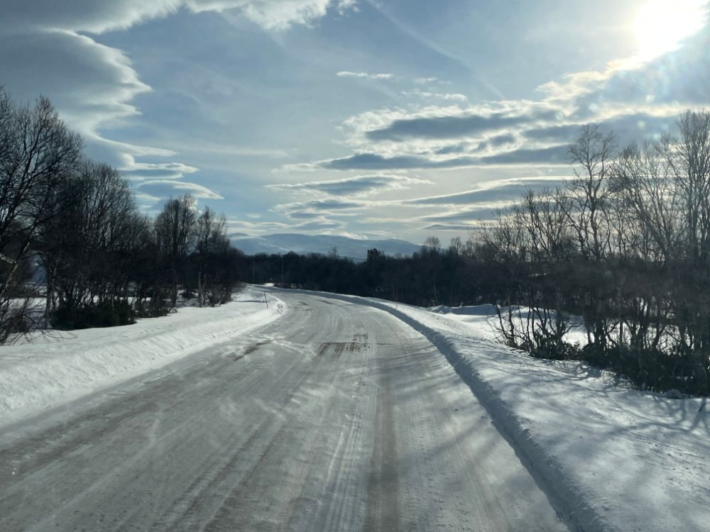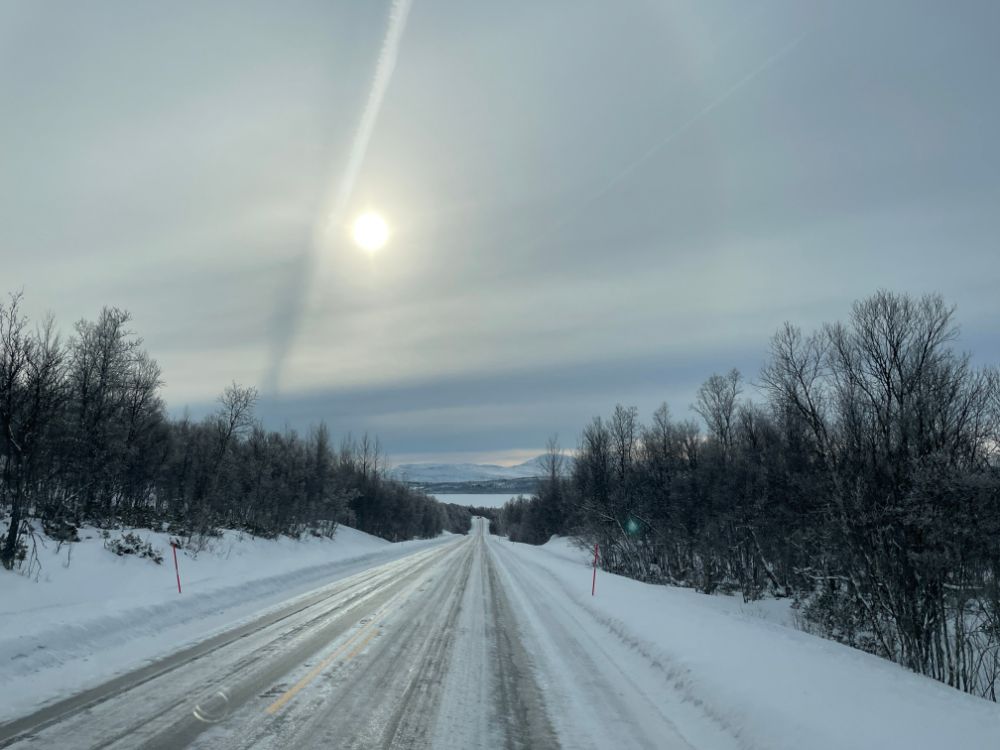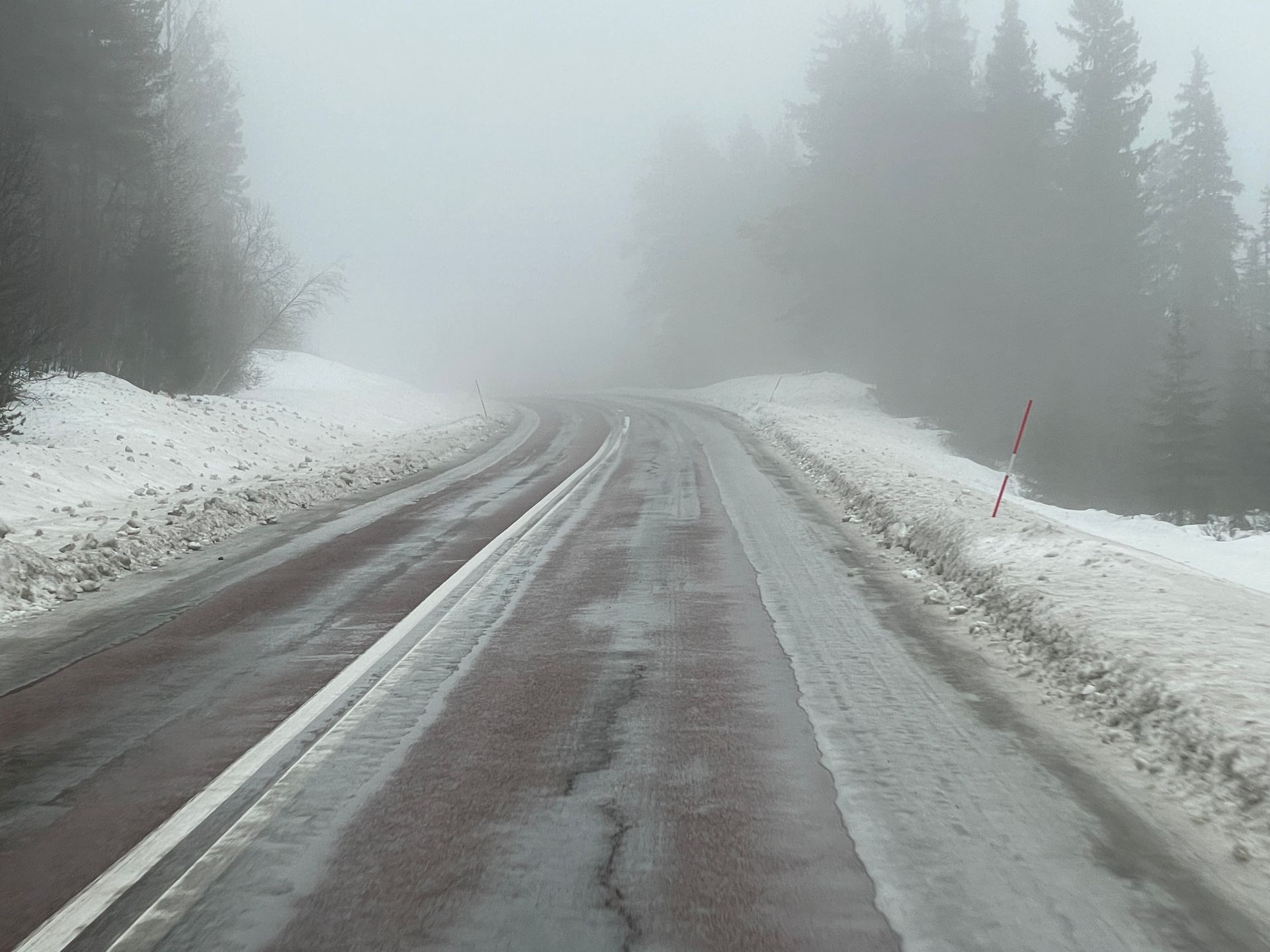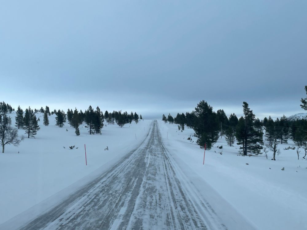 Der Tag ist grau und regnerisch. Die Strasse ist anfangs noch sehr gut zu befahren, schnee- und eisfrei. Aber das ändert sich schlagartig. Und was jetzt folgt ist die schlimmste Fahrt dieser ganzen Reise. Plankes Eis und über viele Kilometer stockdicker Nebel. Aber das Wissen, dass ein Grossteil aller Verkehrsteilnehmer mit Spikes unterwegs sind , lässt uns etwas gelassener um die Kurven fahren.
