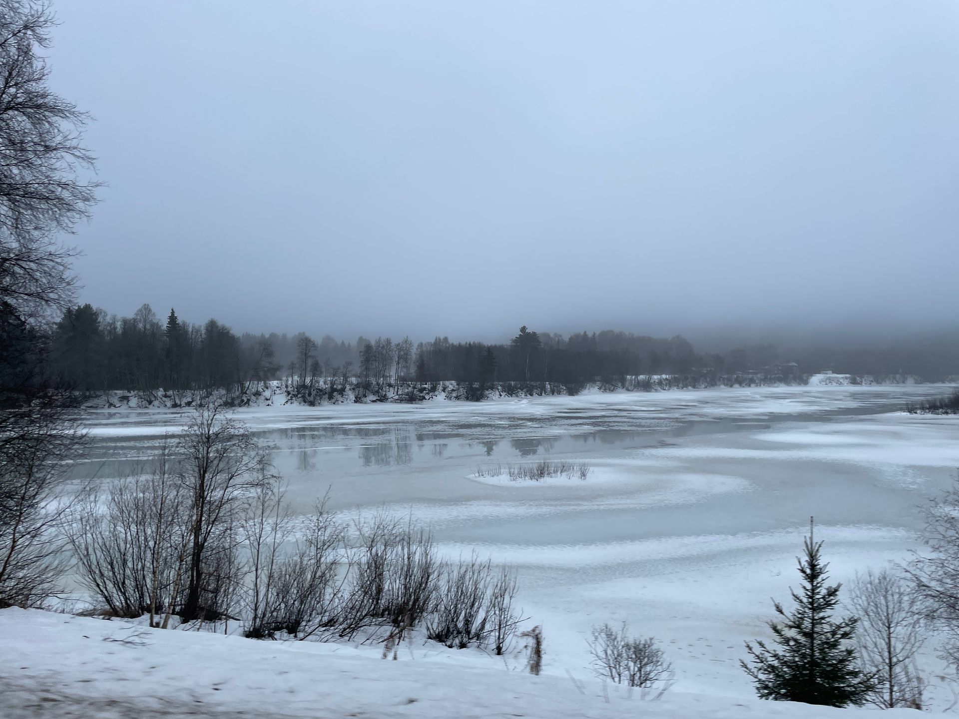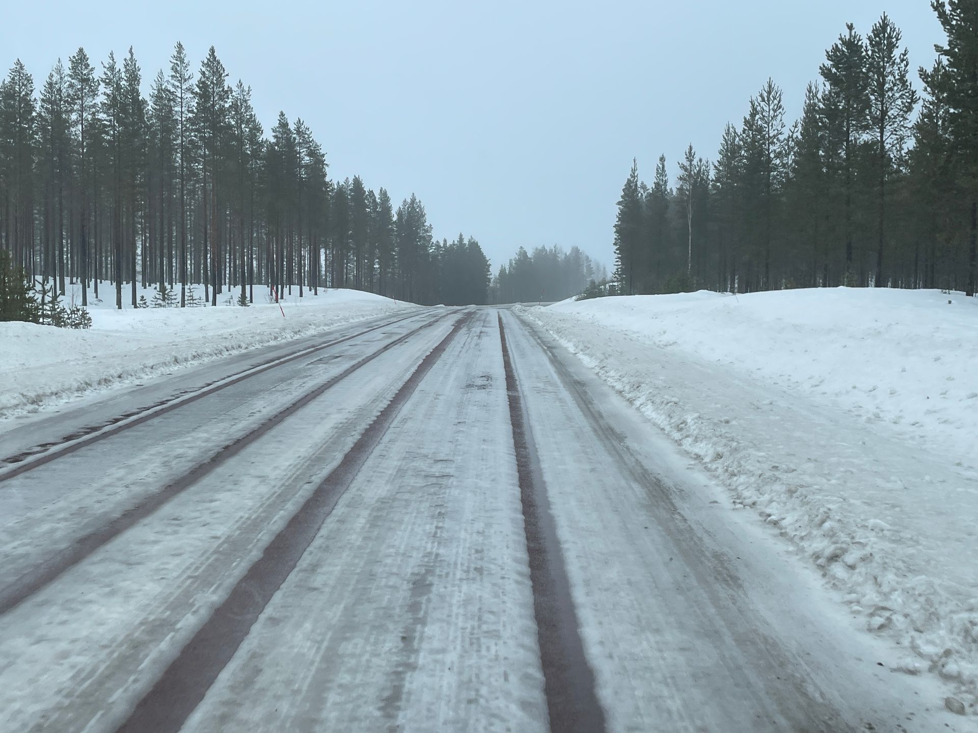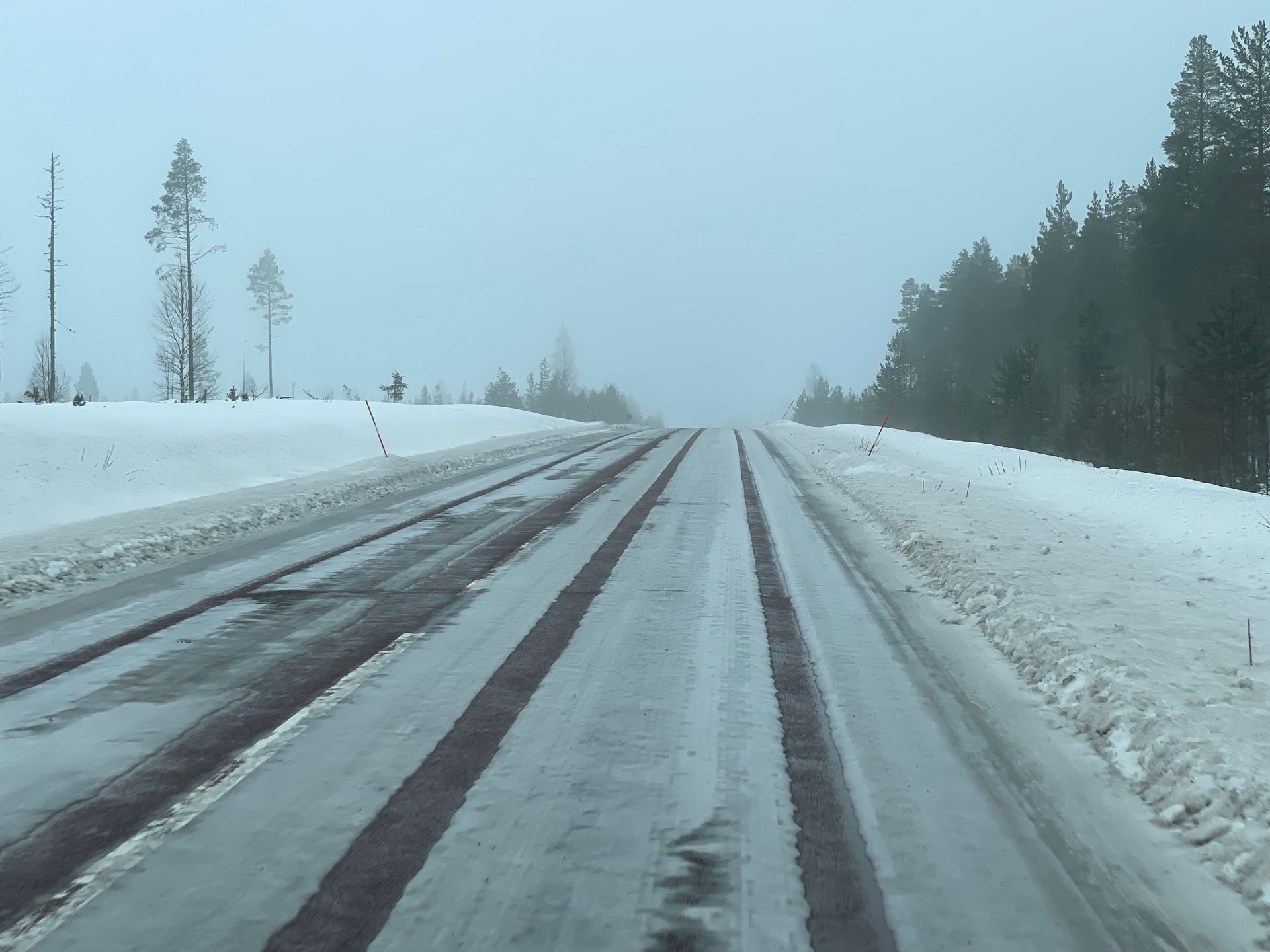 Der Tag ist grau und regnerisch. Die Strasse ist anfangs noch sehr gut zu befahren, schnee- und eisfrei. Aber das ändert sich schlagartig. Und was jetzt folgt ist die schlimmste Fahrt dieser ganzen Reise. Plankes Eis und über viele Kilometer stockdicker Nebel. Aber das Wissen, dass ein Grossteil aller Verkehrsteilnehmer mit Spikes unterwegs sind , lässt uns etwas gelassener um die Kurven fahren.
