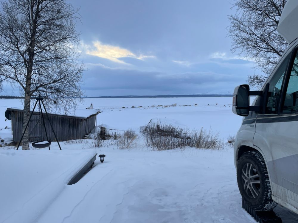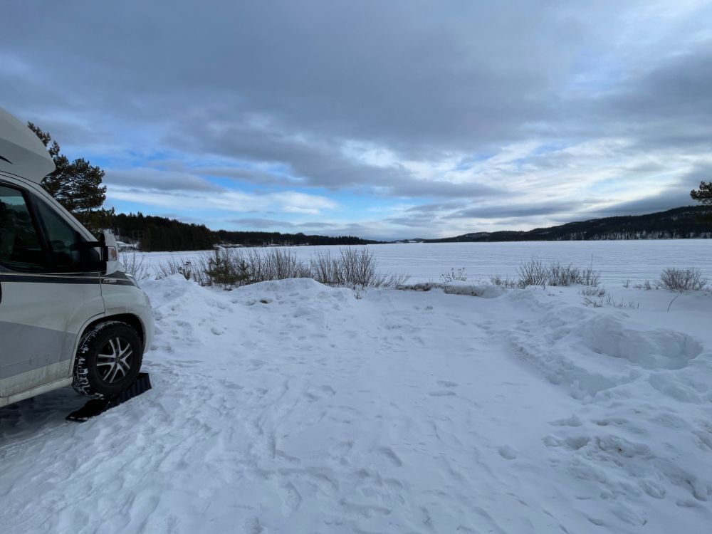 Schon gestern bei der Ankunft auf dem Campingplatz mussten wir kleine Schneeverwehungen durchfahren, um auf den Platz unten am See zu gelangen. Wie und ob wir da wieder hochkommen hat uns aber nicht interessiert. Morgen starten wir in einen neuen Tag, haben wir uns gesagt, und dann schauen wir mal, wie es aussieht. Der Wind blieb auch über Nacht stürmisch und zudem schneite es auch etwas.