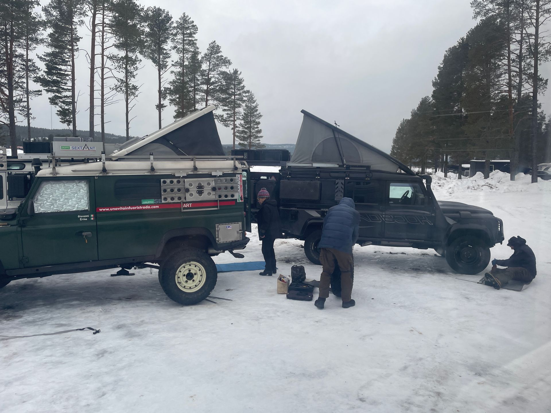 Klar sind ja alle drei Fahrzeuge mit 4x4 ausgerüstet und doch wird von allen heute Morgen die Montage von Spikes in Angriff genommen. Ein umfangreiches Unterfangen – jeder Reifen wird demontiert, Spikes reingeschraubt und dann wird der Reifen wieder montiert. Sie starten mit dieser Arbeit so gegen 7.30 Uhr und wir fahren um 9.30 Uhr rauf zur Reception, aber die Spikemontage ist noch lange nicht beendet!
