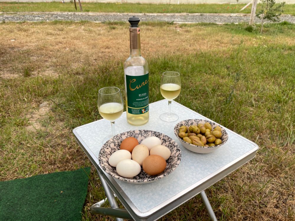 Wir werden herzlich begrüsst und mit Hilfe der Google-Übersetzungs-App unterhalten wir uns bestens. Wir sind die einzigen Gäste und werden richtig verwöhnt. Eier, Oliven, Gurken und Paprika landen in unserem Pfüdi. Die Oliven verspeisen wir zu unserem Glas Weisswein und die Eier verarbeiten wir gleich für unser Nachtessen - es gibt Spiegeleier mit Brot.