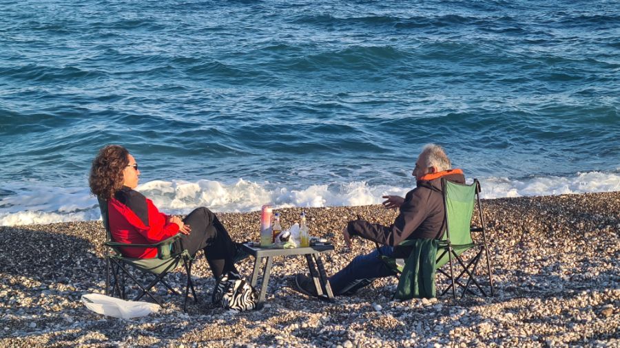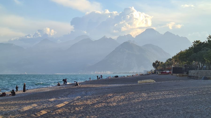 Im Hintergrund das Taurusgebirge und am Strand die Einheimischen bei ihrer Lieblingsbeschäftigung - picknicken!