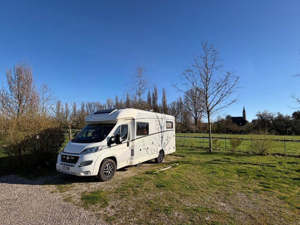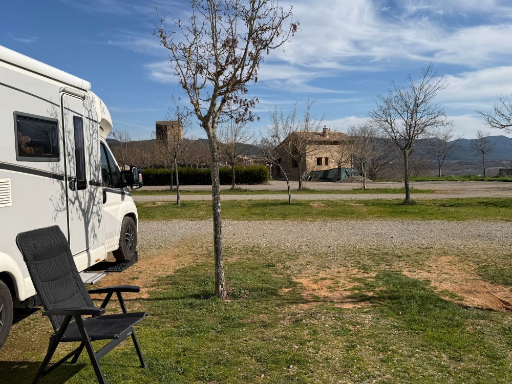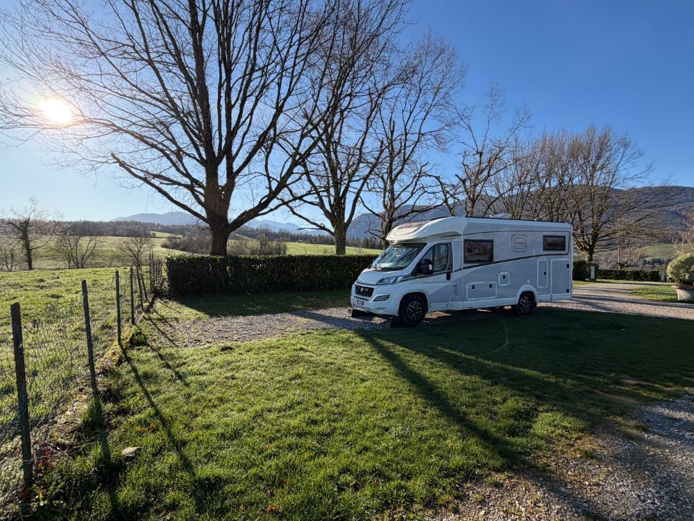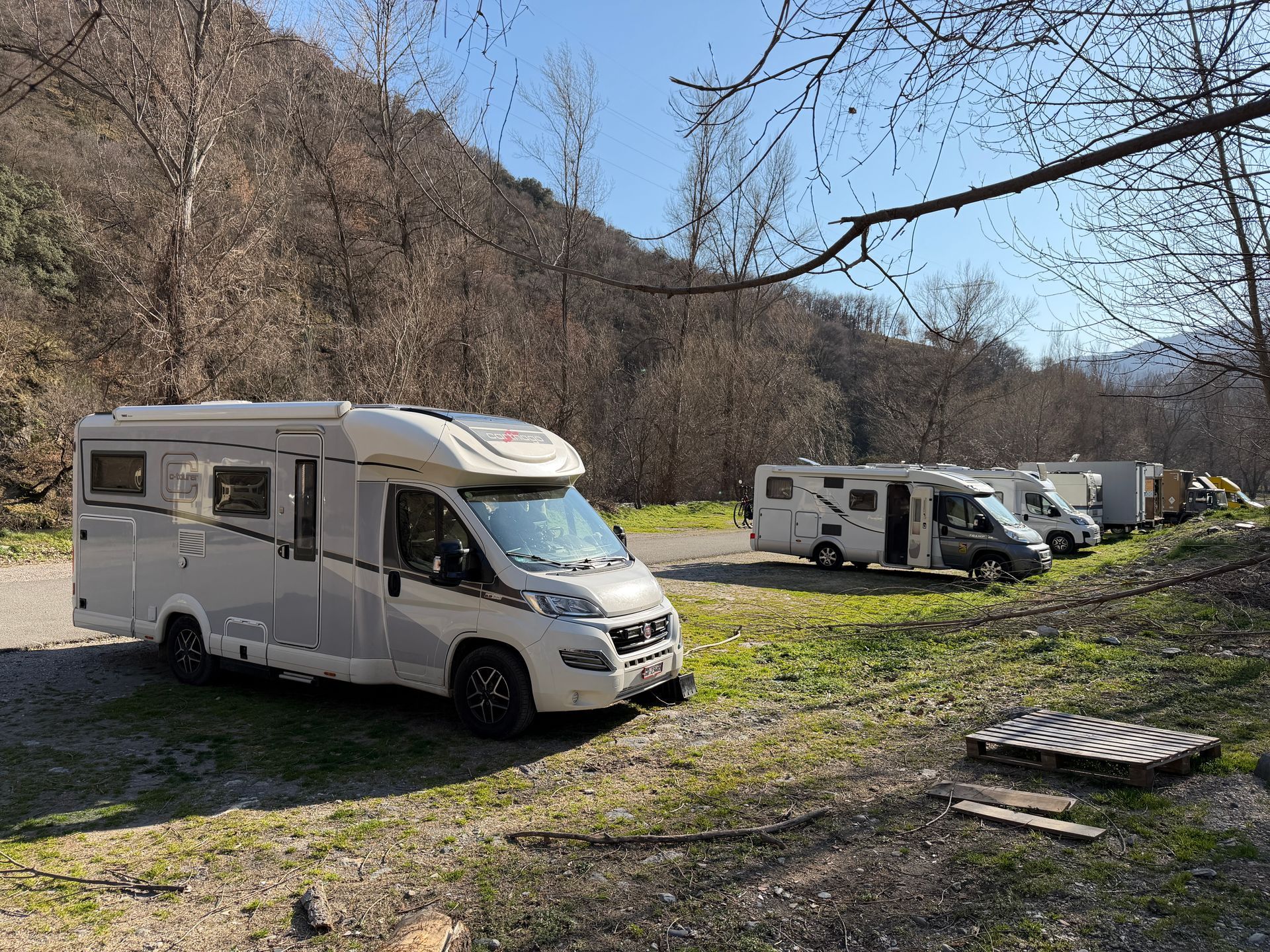 18 Kilometer später finden wir unseren Schlafplatz. Etwas ausserhalb von einem kleinen Dorf. Die auch hier recht nahe Strasse ist nur sehr spärlich befahren, die Luft ist rein und so bezahlen wir die 10 Euro gerne und richten uns ein. Das Wetter war den ganzen Tag strahlend schön und wir geniessen hier die Sonne draussen bei einem Apero.