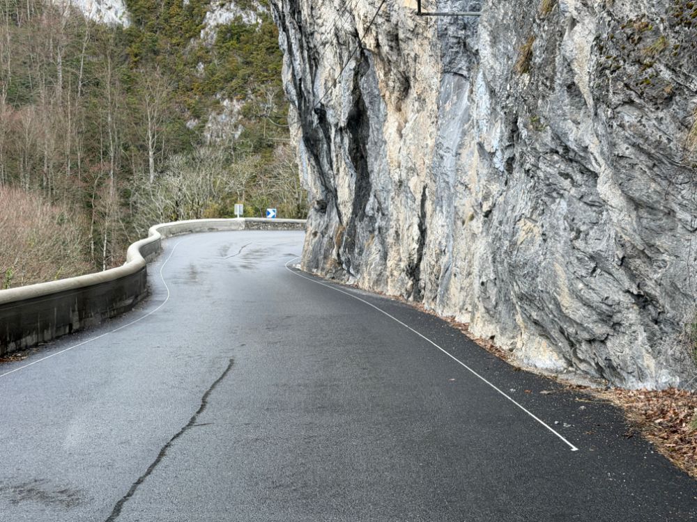 In Jaca stoppen wir für einen Einkauf, der Kühlschrank weist grosse Lücken auf. Und hier entscheiden wir uns, die Himmelsrichtung zu wechseln und fahren über den Col du Somport (1'631 m ü M) rüber nach Frankreich. Der Regen geht doch tatsächlich kurz in einen leichten Schneefall über, und die beiden Skigebiete auf der Passhöhe sind sehr gut besucht. Neben vielen PW's stehen da auch sehr viele Womo's und die Mehrheit hat spanische Autokennzeichen. Auf der französischen Seite ist der Verkehr plötzlich fast Null und die Fahrt durch's Vallée d'Aspe hinaus zieht sich ganz schön.