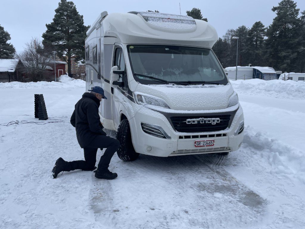 Yesterday, parts of the roads were suddenly covered in snow. For us, that means it's time for the spikes. And here at the campsite, that works well. Hansruedi manages both front wheels in 1.5 hours. That means around 100 spikes per wheel. That's enough for today, especially since the rear wheels are harder to spike because you can't turn them off.