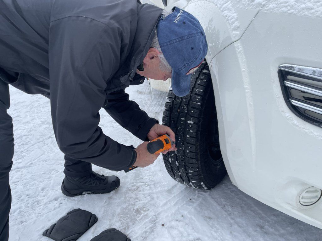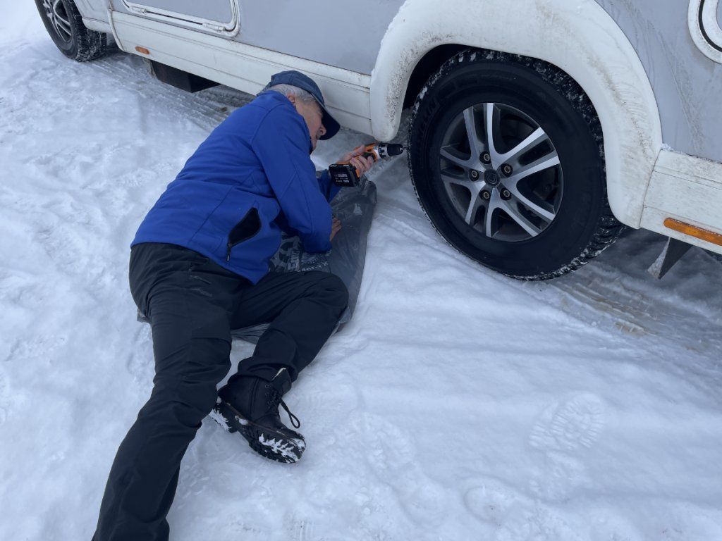 Today it's one of the rear wheels' turn to be studded. I definitely did a better job. I can sit behind the wheel in the warmth and move forward a few centimeters every few minutes. The good news is that with all the work, even in Mora, it's not too cold!