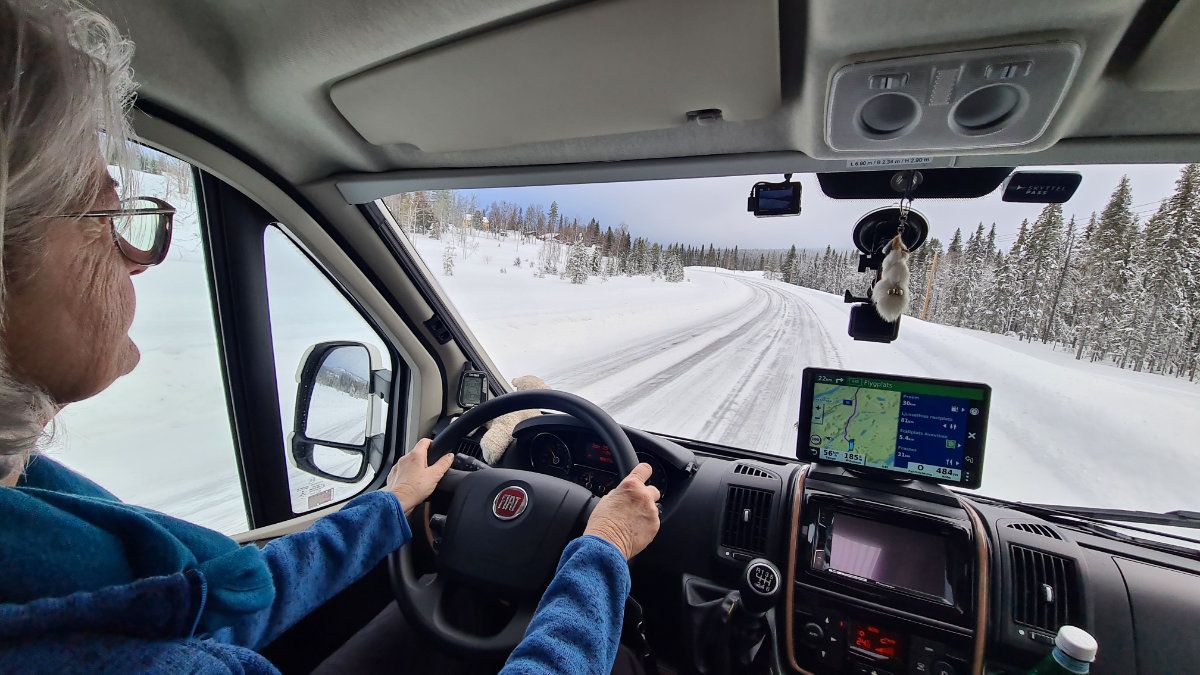 We use a cleared rest area for our lunch break. And then I (Heidi) get behind the wheel and as soon as we set off the road turns white. Snow, ice and a huge bumpy track in between. I think we'll have to tighten a few screws at home ;-)