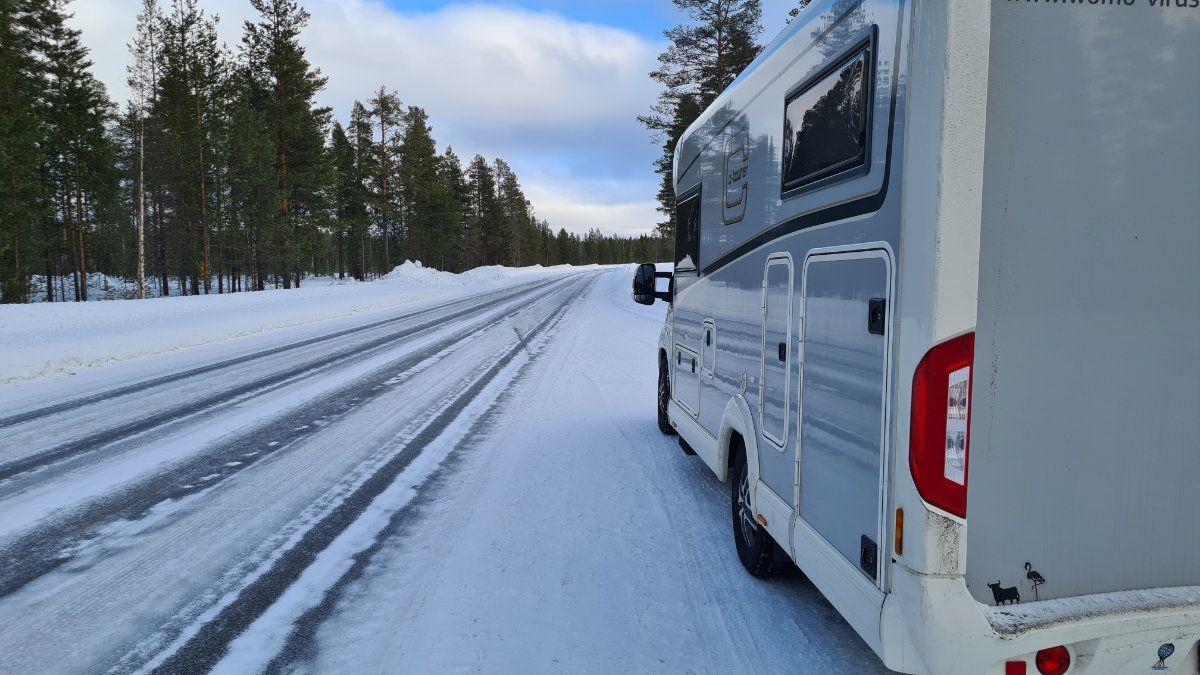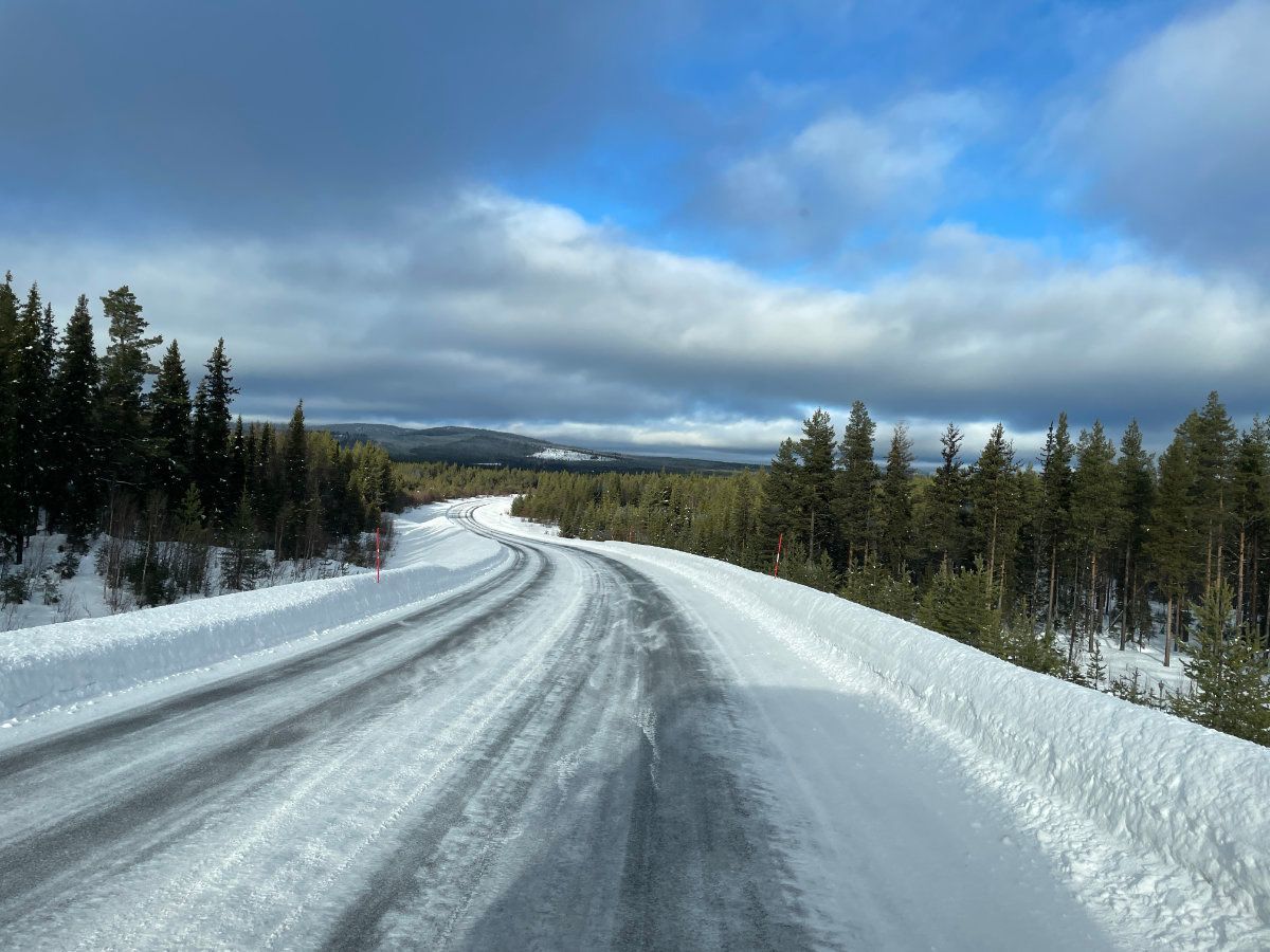 Hmm, wrong again. The E45 towards Östersund is an icy bumpy track for many kilometers at the beginning. We are already glad we have the spikes.