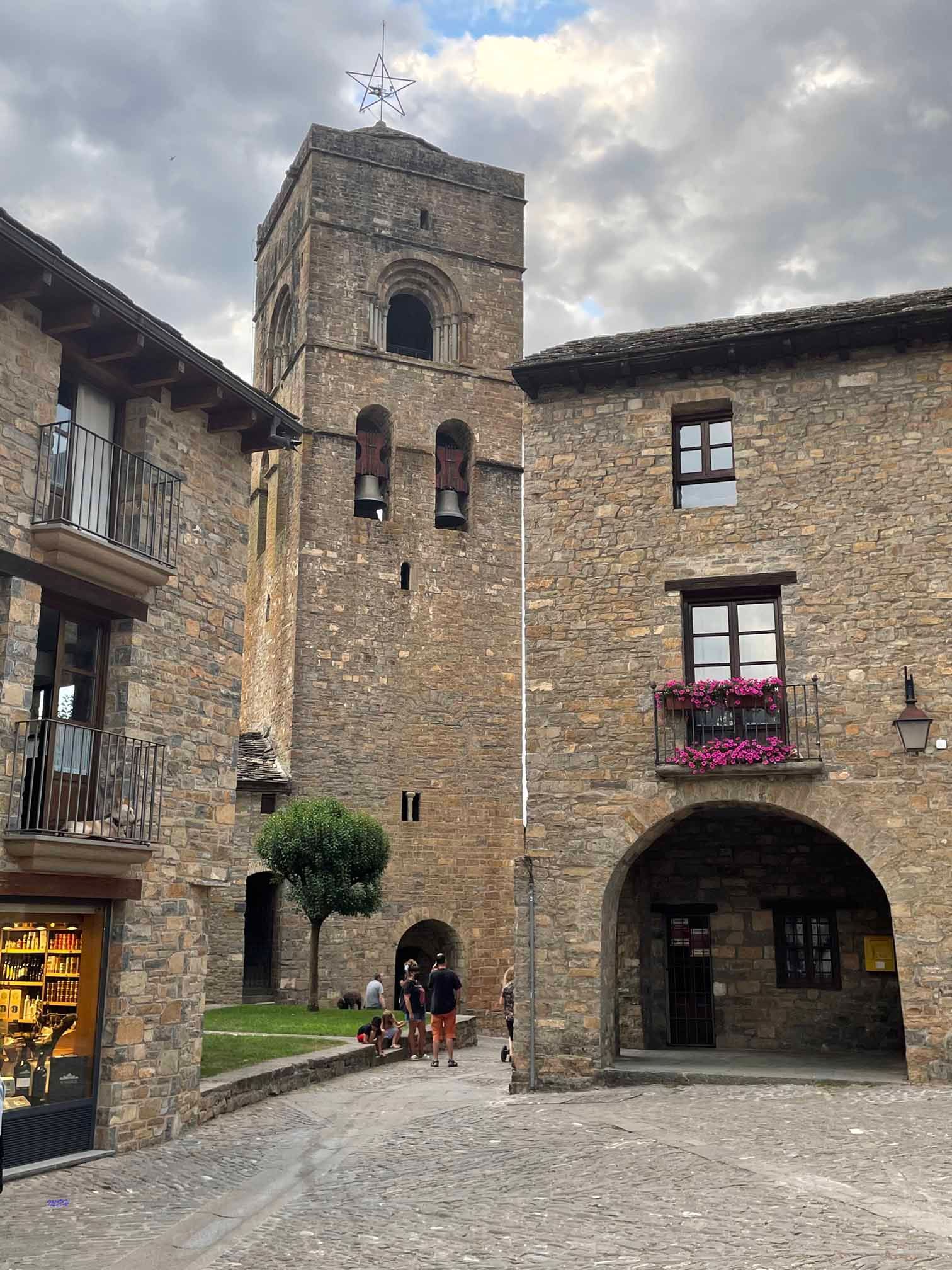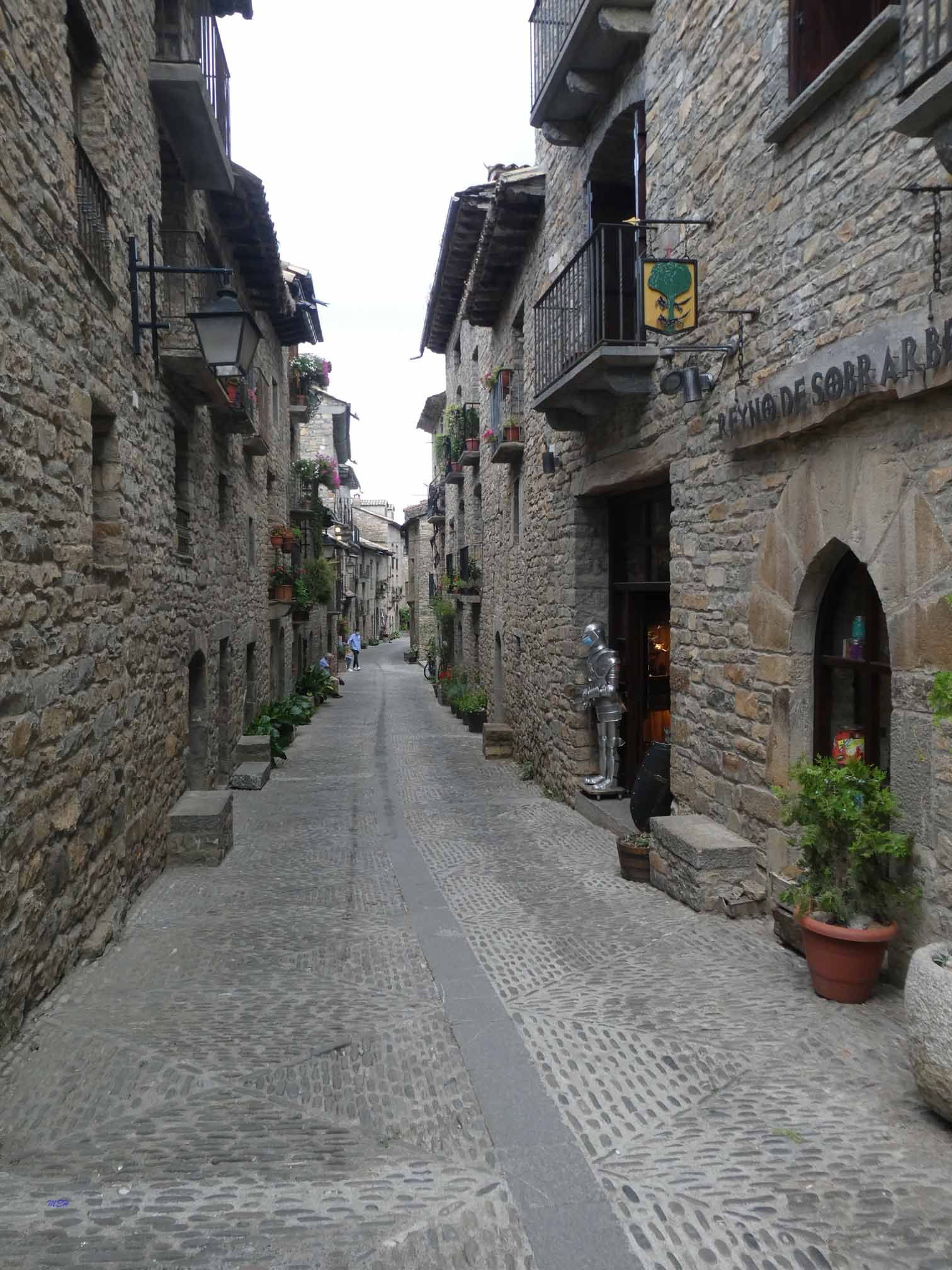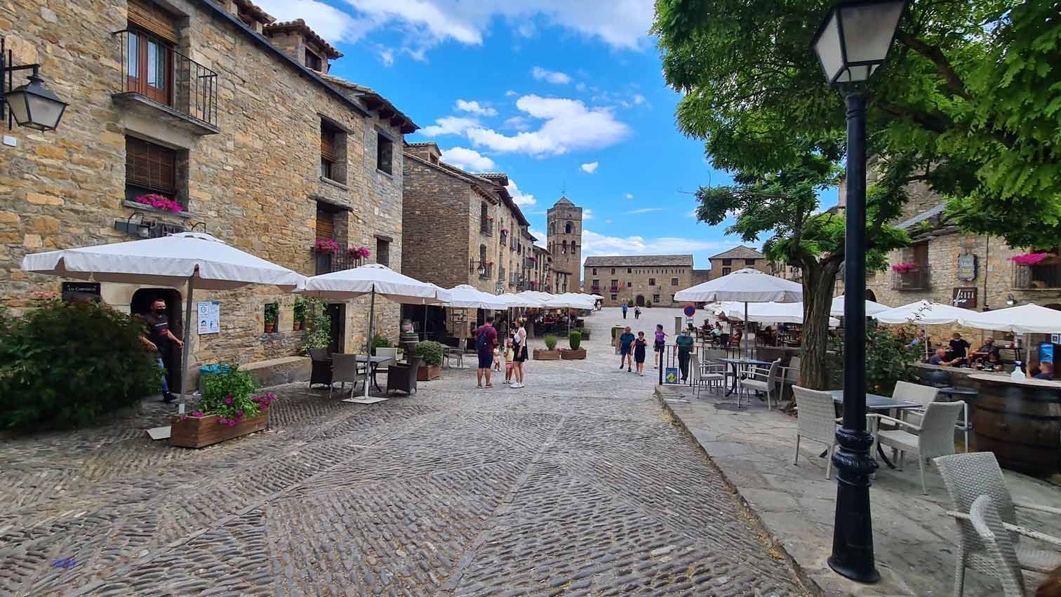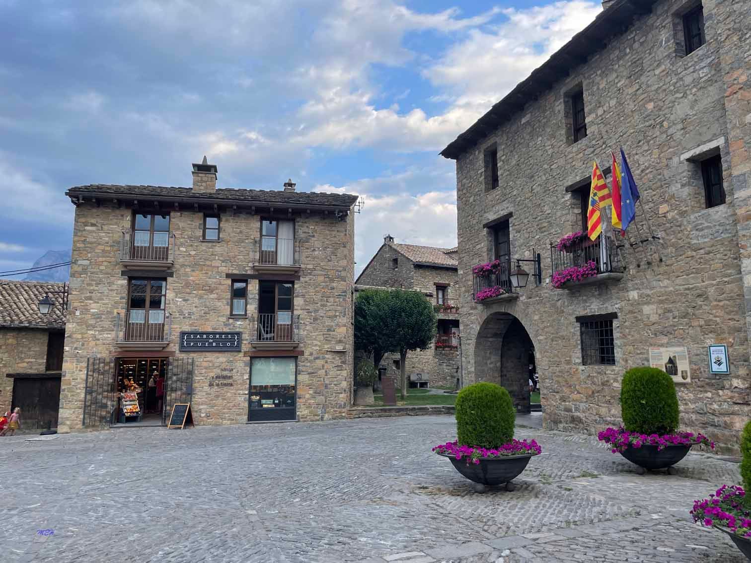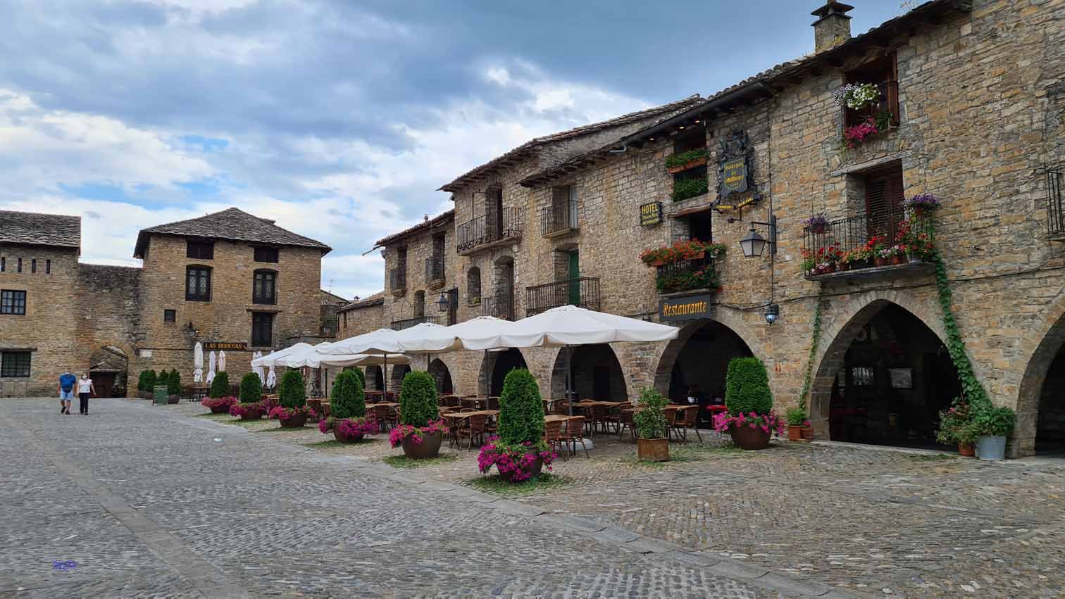 Aínsa, a pretty little town, offers a huge RV parking space for 3 euros. We arrive at around 3 p.m. and there are so many free spaces that we almost can't decide. The corner space in the picture doesn't look bad, does it?