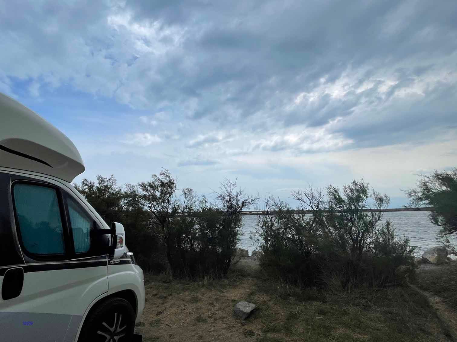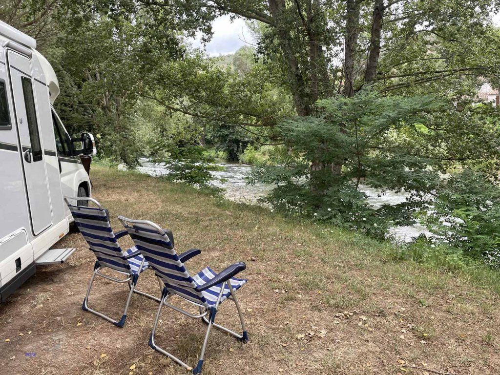 We park at the first parking spot we come to, have a beer and a glass of rosé, and then after almost an hour we decide that we're not staying here. Music is blaring from the building next to the spot and it doesn't really look very inviting. So we start the engine again and drive on. The parking spot in Quillan belongs to the Pass'Etapes group and without this card we can't get in, the display doesn't work. So we make a third attempt and drive another 10 kilometers to Espéraza. And here we finally find what we're looking for and are now right by the river.