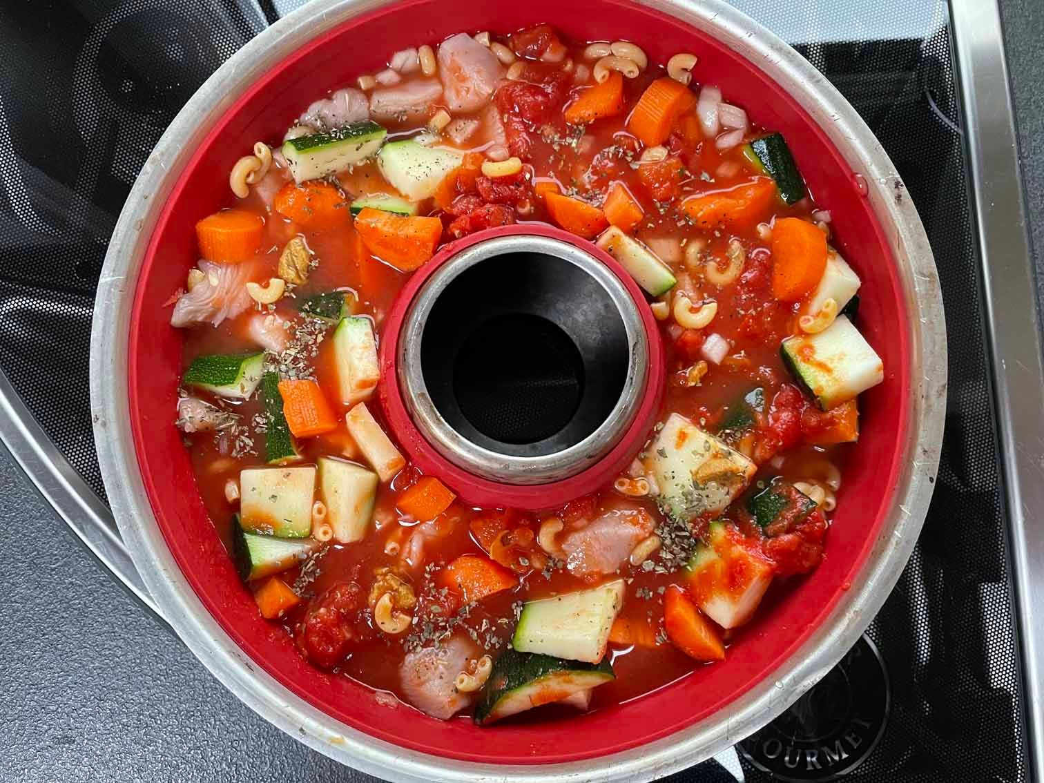 Das On-Pot-Gericht mit Poulet, Gemüse, gehackten Tomaten und Bouillon mundet uns ausgezeichnet.