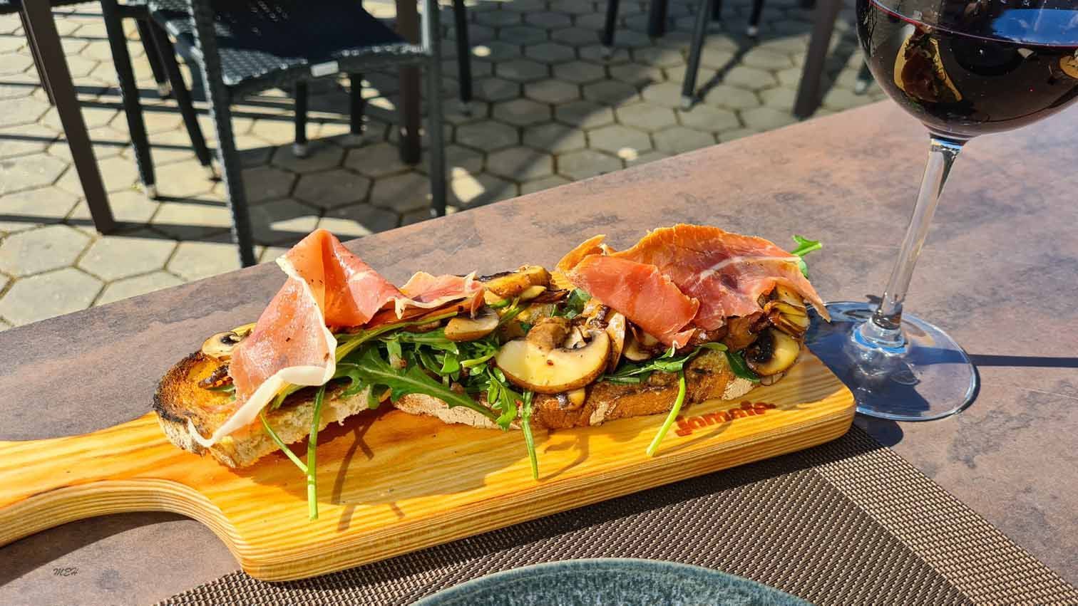 Wir können sogar draussen sitzen und geniessen ein feines Mittagessen. Keine portugisische Küche, aber der Italiener ist auch ausgezeichnet und der Wein kommt aus dem Duoro-Tal.