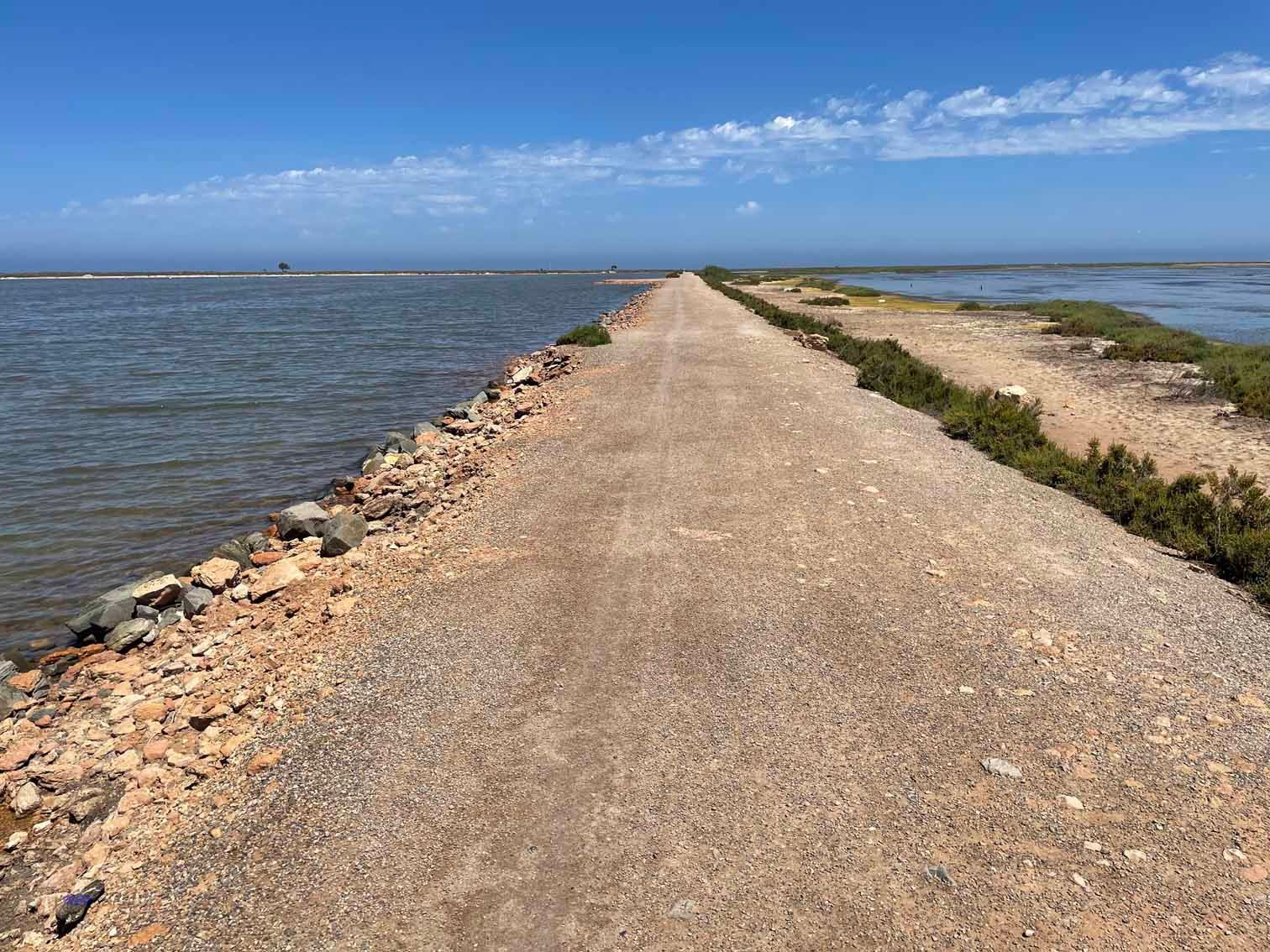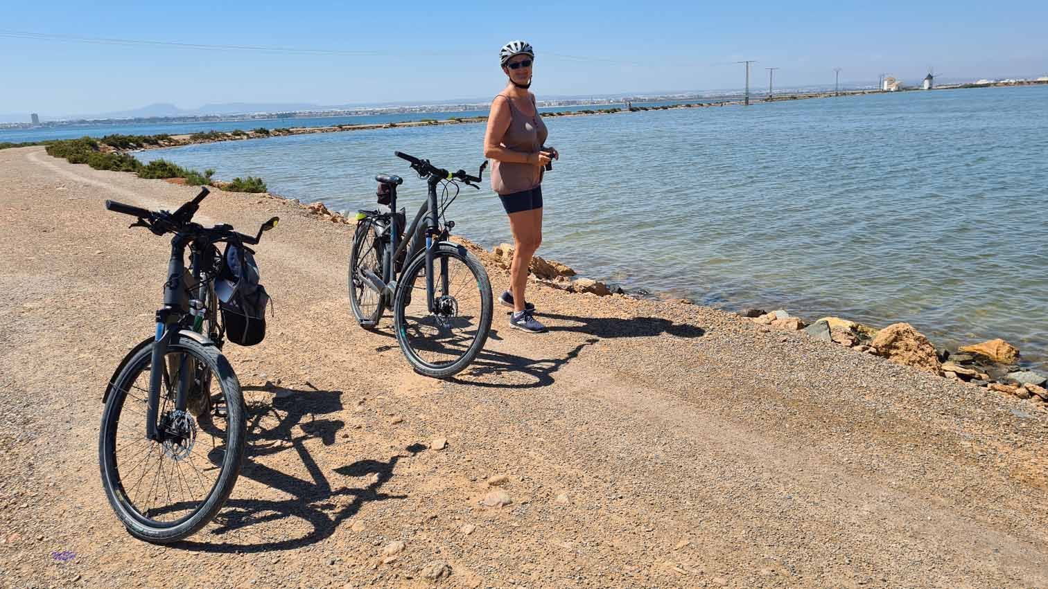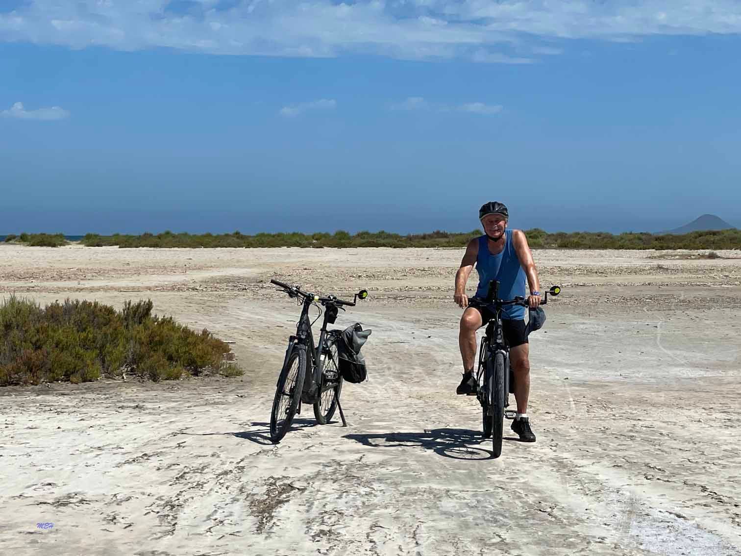 Der riesige Camper Park La Ribera in San Javier hat wenigstens ein paar Schattendächer und es weht ein herrlicher Wind. Das passt. Nach einem kleinen Mittagsimbiss und etwas Siesta fahren wir mit unseren Bikes dem Strand entlang Richtung Salinen. Ein toller Bike-Ausflug.