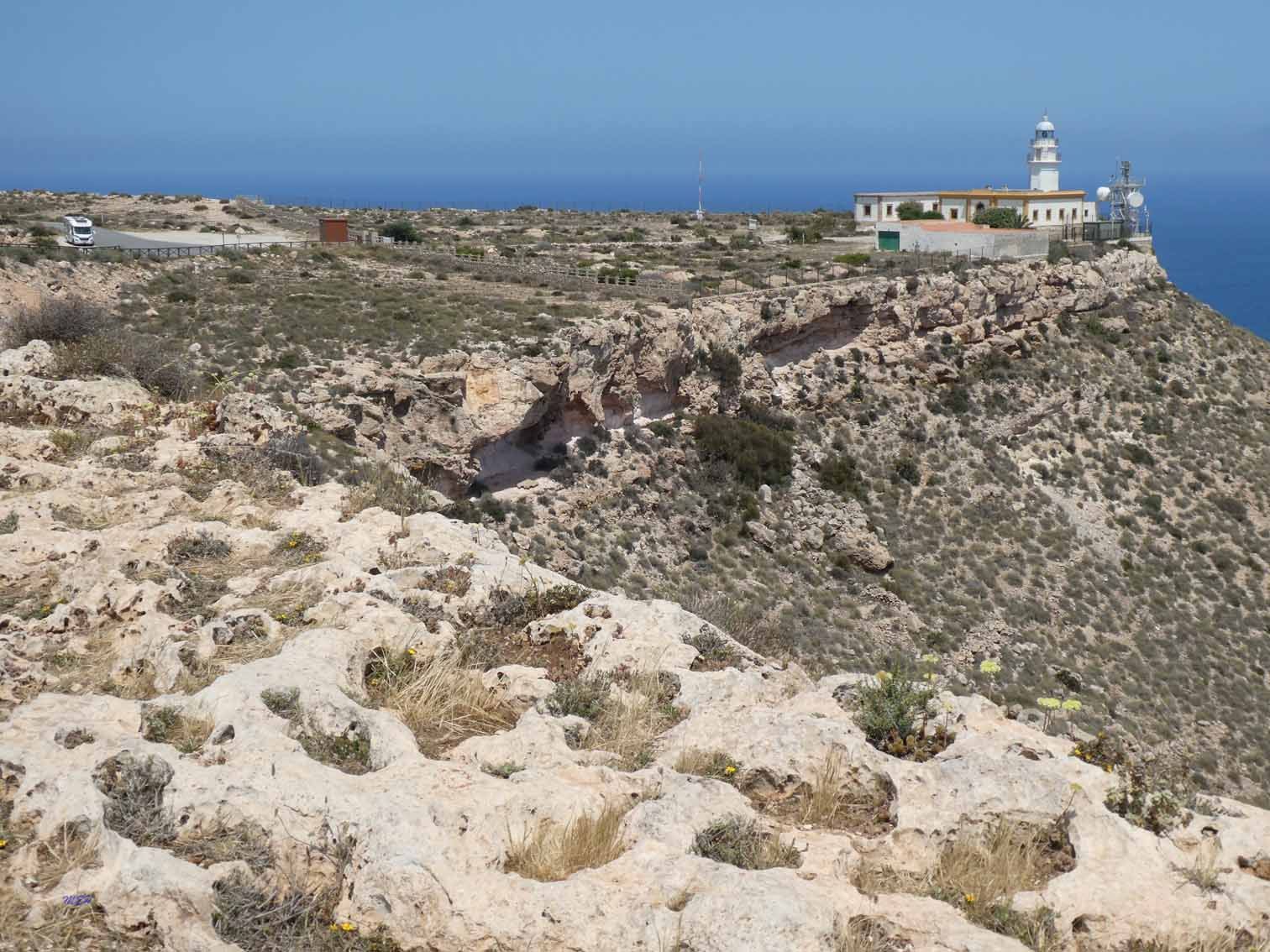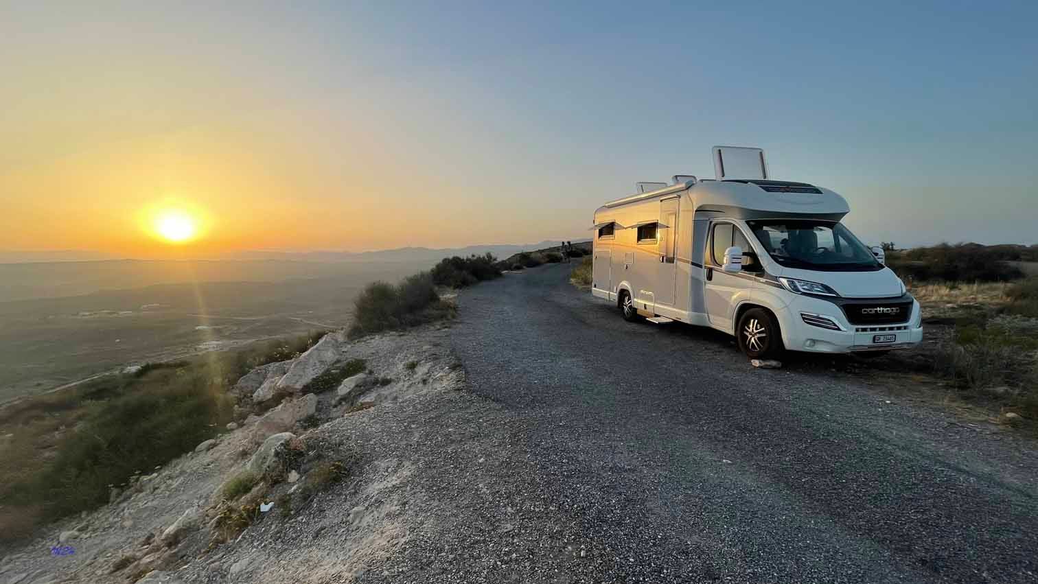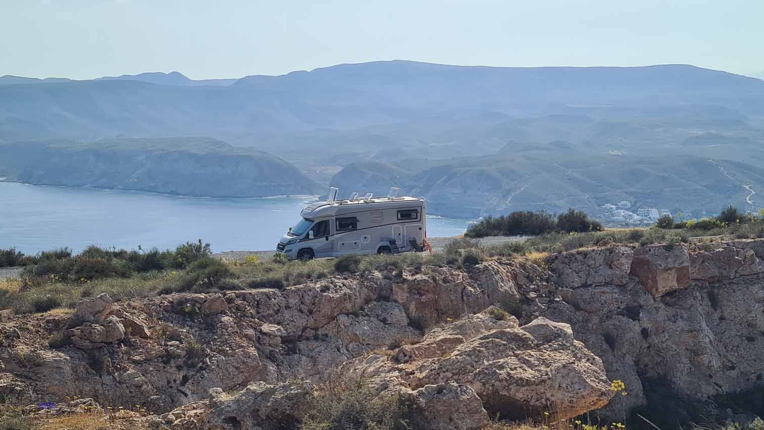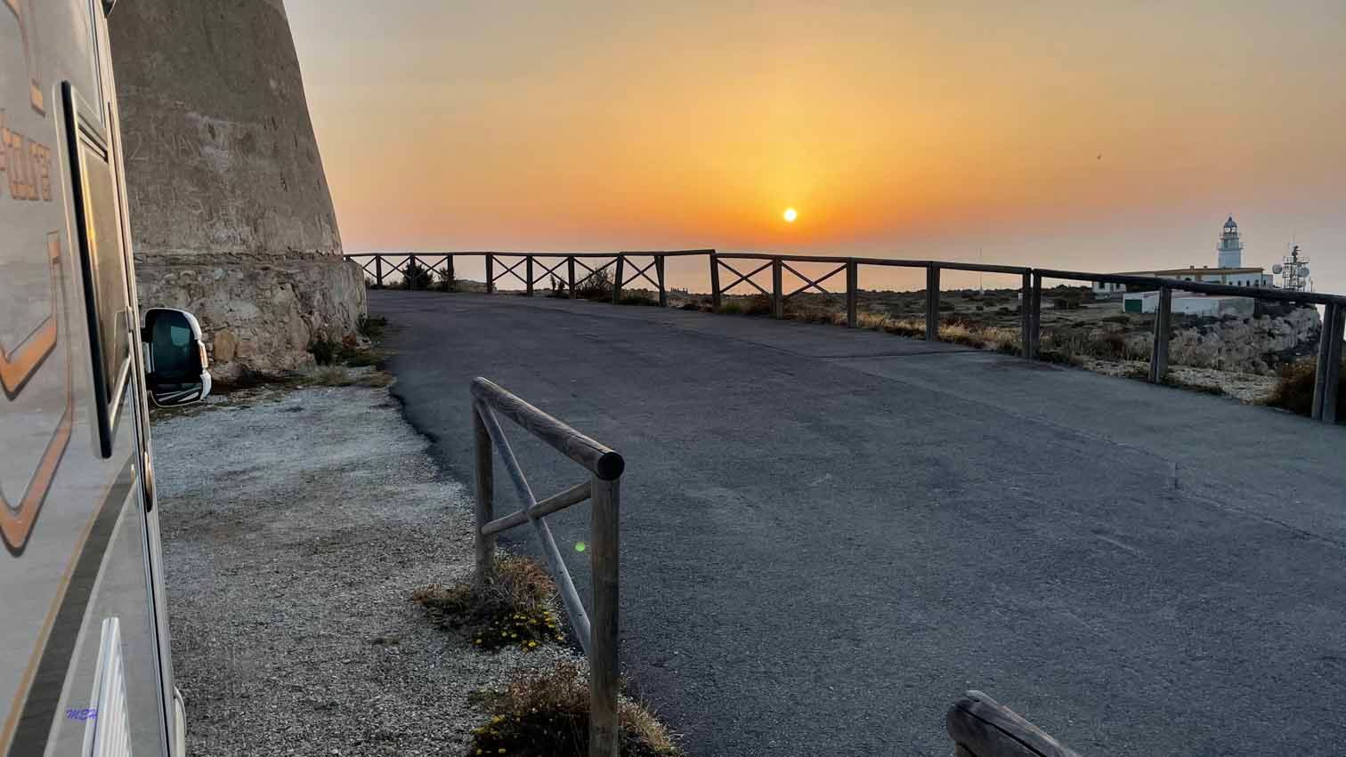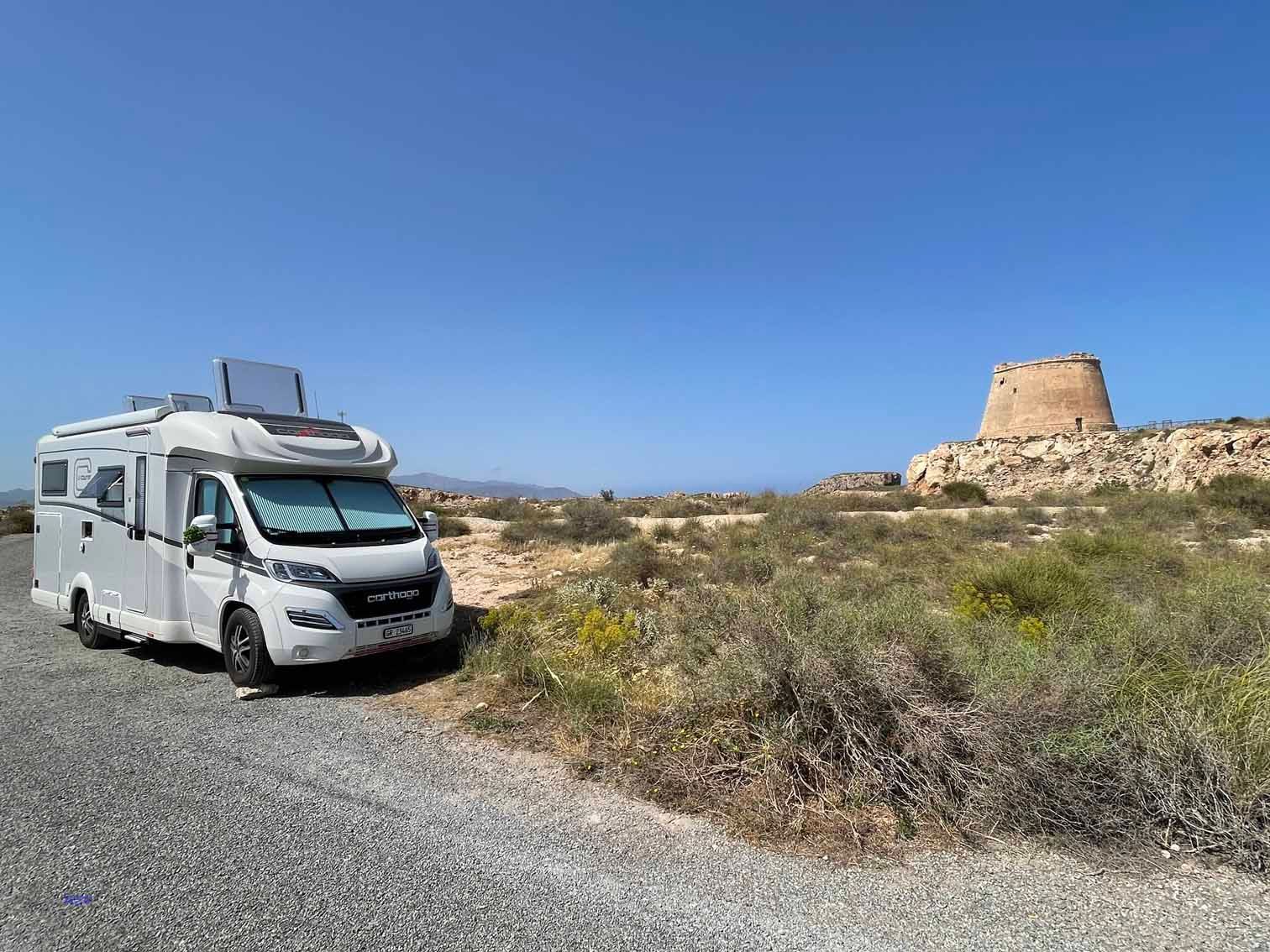 Dann fahren wir weiter Richtung Cabo de Gata. Ein angepeilter Parkplatz ist fast voll. Dicht an dicht stehen PW's und Womo's. Ups wir sind definitv in der Hochsaison angekommen. Aber da führt noch eine steile Stichstrasse hoch zum Faro und Torre de la Mesa Roldán. Da kommt er wieder zum Einsatz, unser spontaner Blinker.