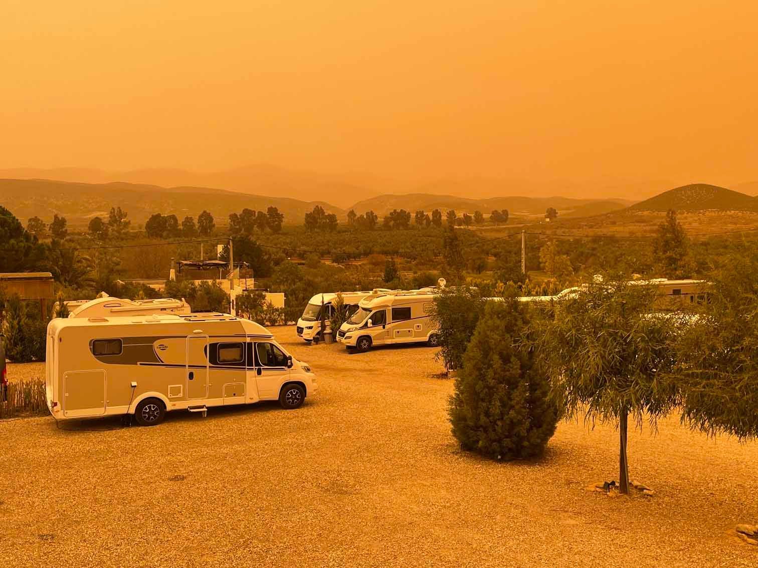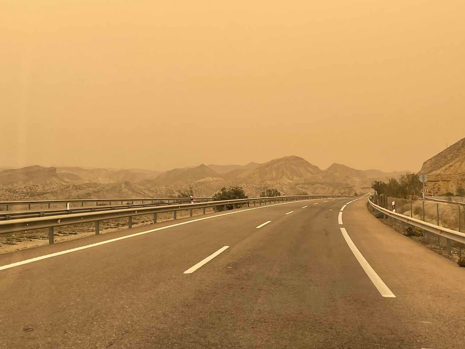 Wir fahren zurück an die Küste. Ein Einkauf im Supermarkt steht mal wieder an und dann fahren wir weiter ostwärts. In Almerimar haben wir letzten Sommer übernachtet. Jetzt im März stehen hier mehr Womos als in der Sommerhochsaison. Also gehts weiter zu unserem Tagesziel - die Wüste von Tabernas. Mittlerweile versinken wir im Saharstaub. Die Fotos sind nicht bearbeitet - dies ist die Originalstimmung!!