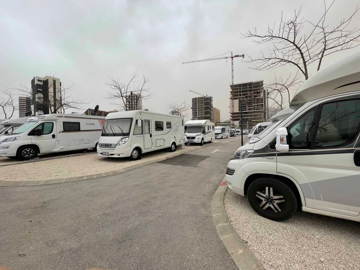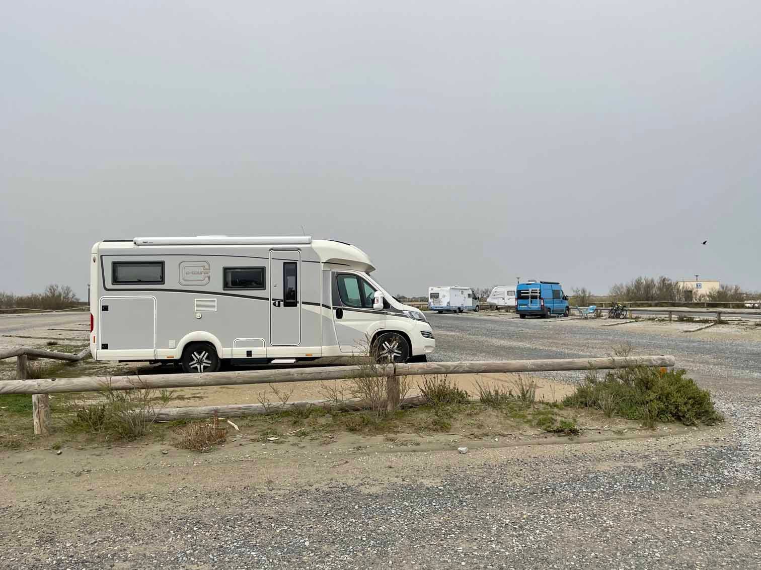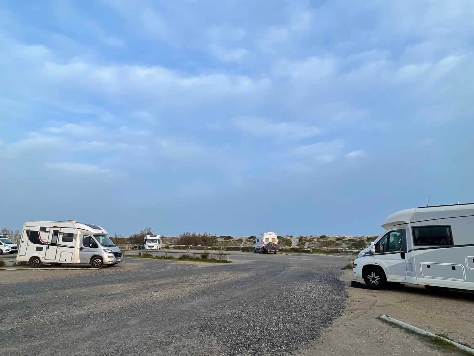 Wir kommen um die Mittagszeit auf dem Stellplatz an. Und hier sieht es so aus wie man das in der Vorsaison erwartet. Wenige Womos, viel Platz!
