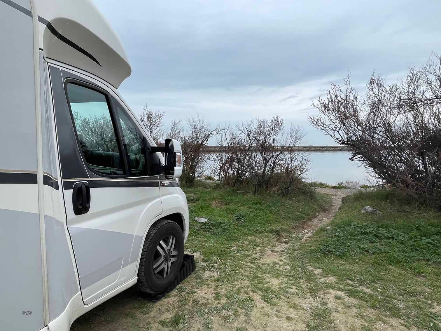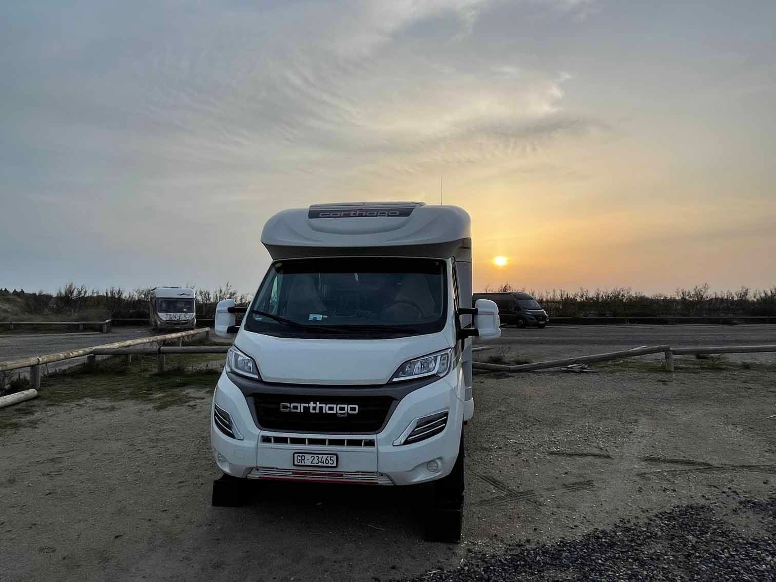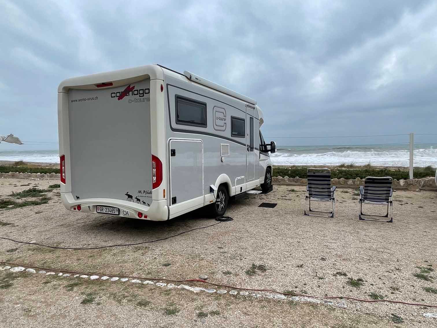 Wir kommen um die Mittagszeit auf dem Stellplatz an. Und hier sieht es so aus wie man das in der Vorsaison erwartet. Wenige Womos, viel Platz!