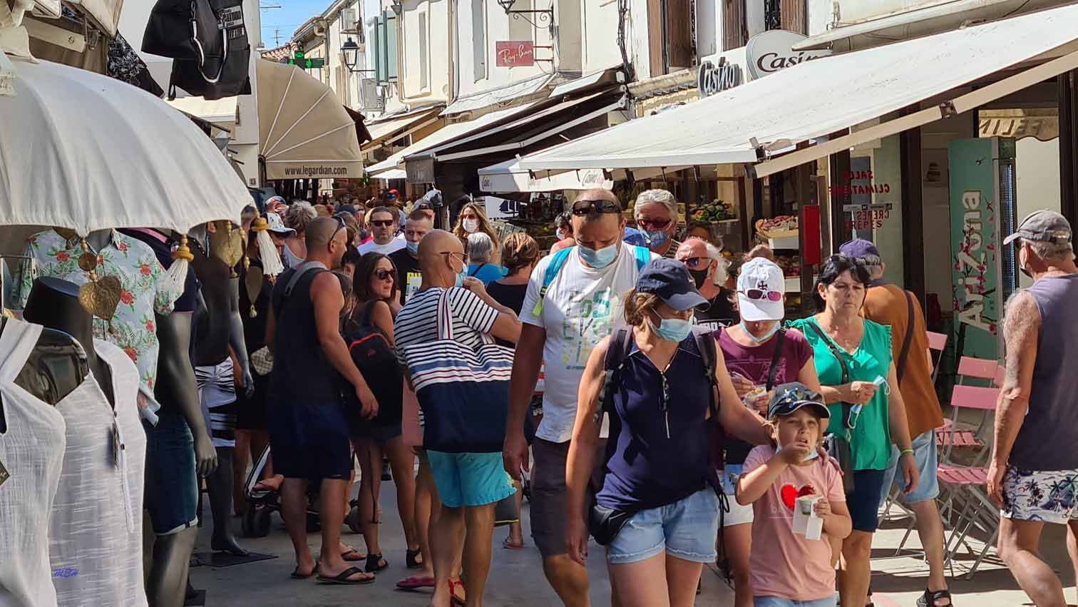 Auf unsererem kurzen Veloausflug sehen wir auch die überfüllten Gassen. Eigentlich wäre hier Maskenpflicht, einzelne halten sich daran. Die Polizei patrouilliert auch, aber was sollen sie gegen diese Masse schon unternehmen. Wir beobachten das Ganze aus der Ferne, ein Foto darf da auch nicht fehlen. Zum Glück sind wir schon mal in aller Ruhe und mit viel Platz durch Saint-Marie-de-la-Mer spaziert.