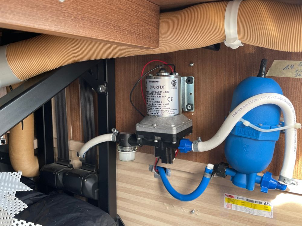 Die Aussendusche konnten wir an die bestehende Wasserleitung (vorgängig Spülung WC) anschliessen. (siehe Foto unten rechts)